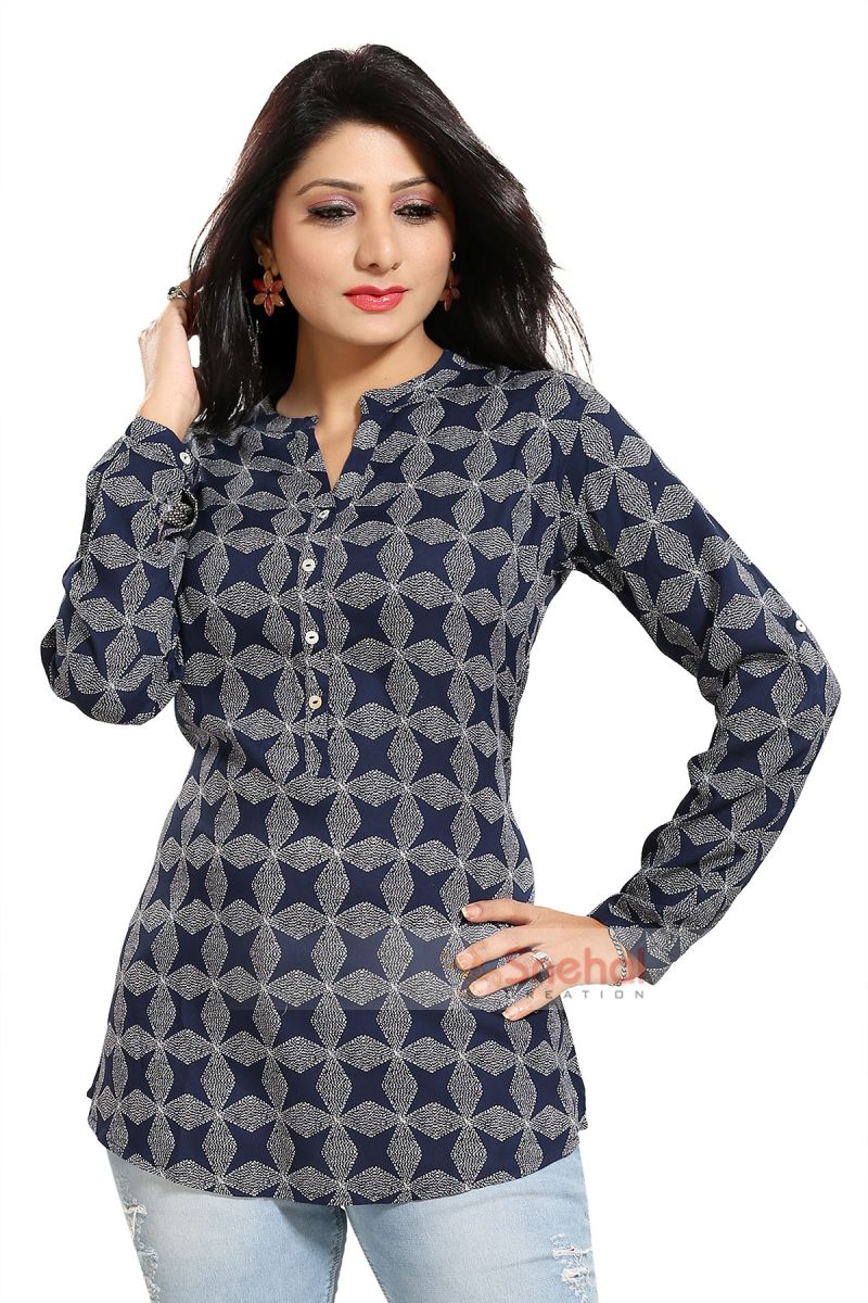 Let your summer season be a celebration of everything fashionable, like this Supreme Style Rayon Cotton Geometric Print Short Tunic Top from the house of Snehal Creations. This ban collared asymmetrical tunic top features full sleeves. It provides full comfort when worn with a pair of jeans or pants. Adorable white buttons deck the gala patti for this piece.
