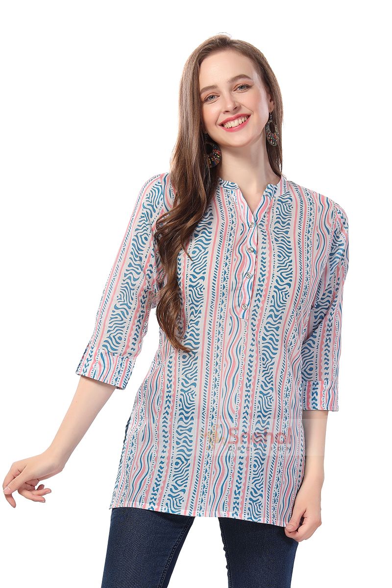 Indulge in contemporary sophistication with our Abstract Allure: Blue Geometric Print Mandarin Collar Tunic. Crafted with precision and style in mind, this tunic seamlessly combines artistic flair with elegance. The captivating blue geometric print adds an element of intrigue and modernity to your outfit, while the mandarin collar infuses a touch of timeless grace. Made from comfortable, breathable cotton, it ensures you stay at ease all day long. This tunic is a versatile choice for various occasions, from casual gatherings to formal affairs. Elevate your fashion game and embrace the allure of abstract geometry with this unique and captivating piece.