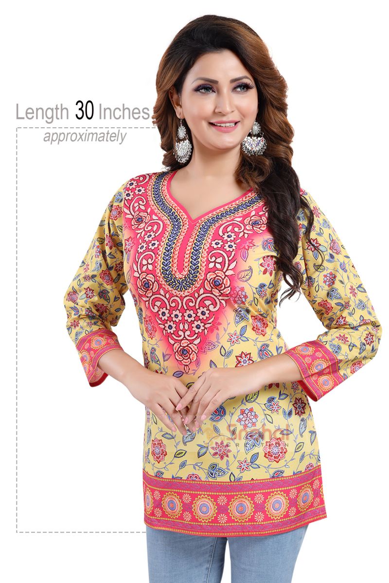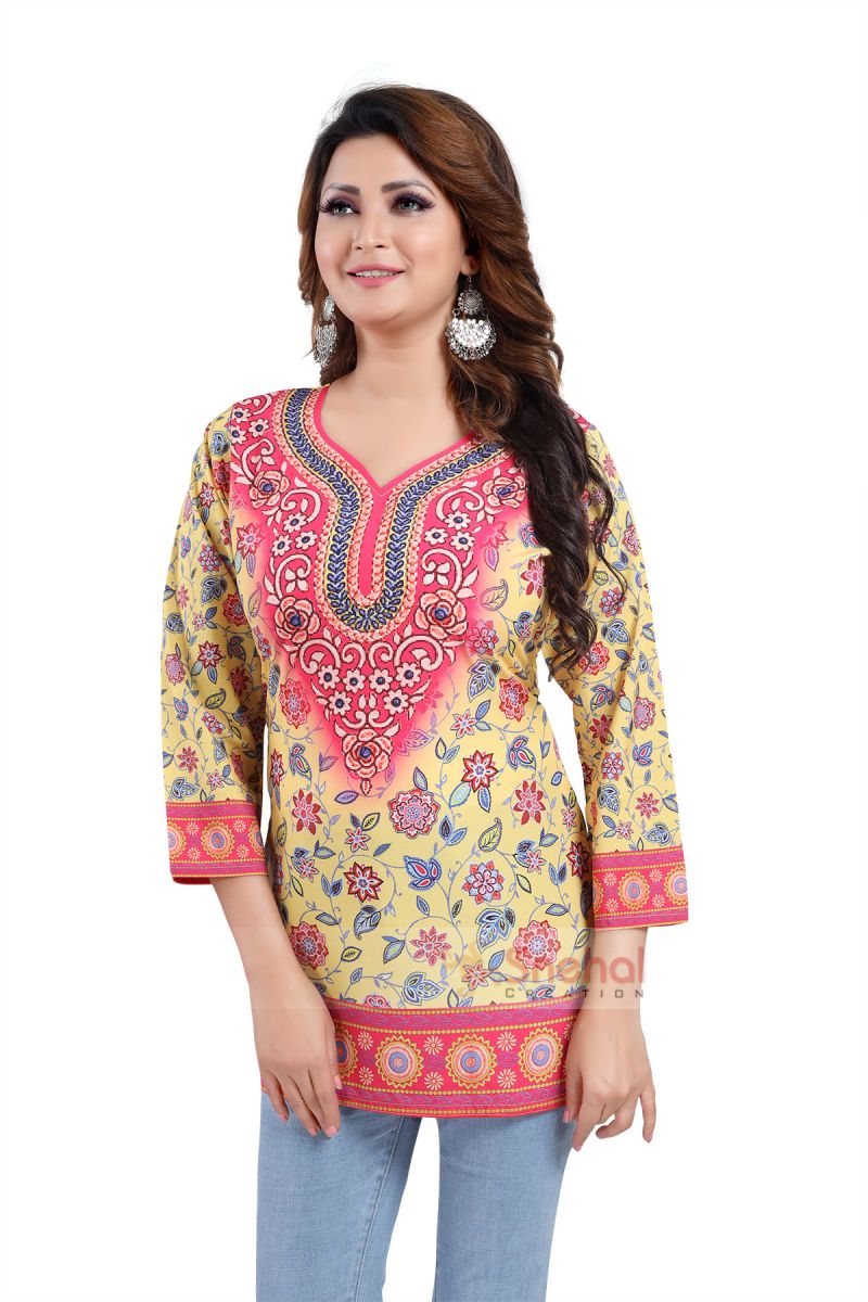 Finding a lively multi-colored kurta for brunch dates? Get your hands on this alluring faux crepe printed short kurti tunic top solely made and sold by Snehal Creation. It is a short-length tunic that has a beautiful sweetheart neckline and 3/4th sleeves. It is a yellow kurti that has got elegant multicolor floral print all over. It also has a red color border on the ends of the arms and bottom of the kurti. It is made from the finest quality of faux crepe which makes it perfect for the summers.