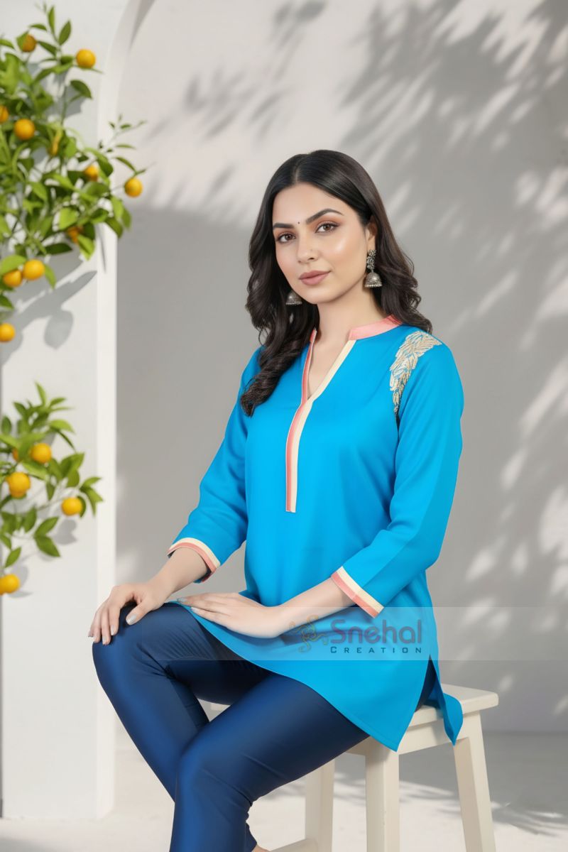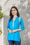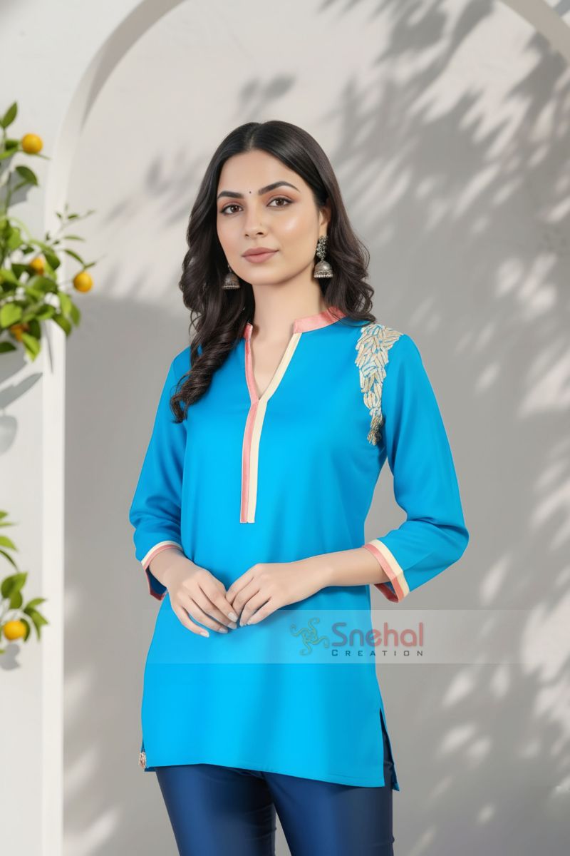 Spark trails of joy as you decide to wear this gorgeous Aqua Love Designer Short Tunic Top for Fashion Lovers and scroll through the day. This kurta is a short length top with a Chinese collar neck line tapped with red and yellow on either sides. Similar double taping lines the edges of the sleeves that run three quarters of the total length. A picturesque embroidery design covers a shoulder on one side of the tunic providing the designer touch to it.