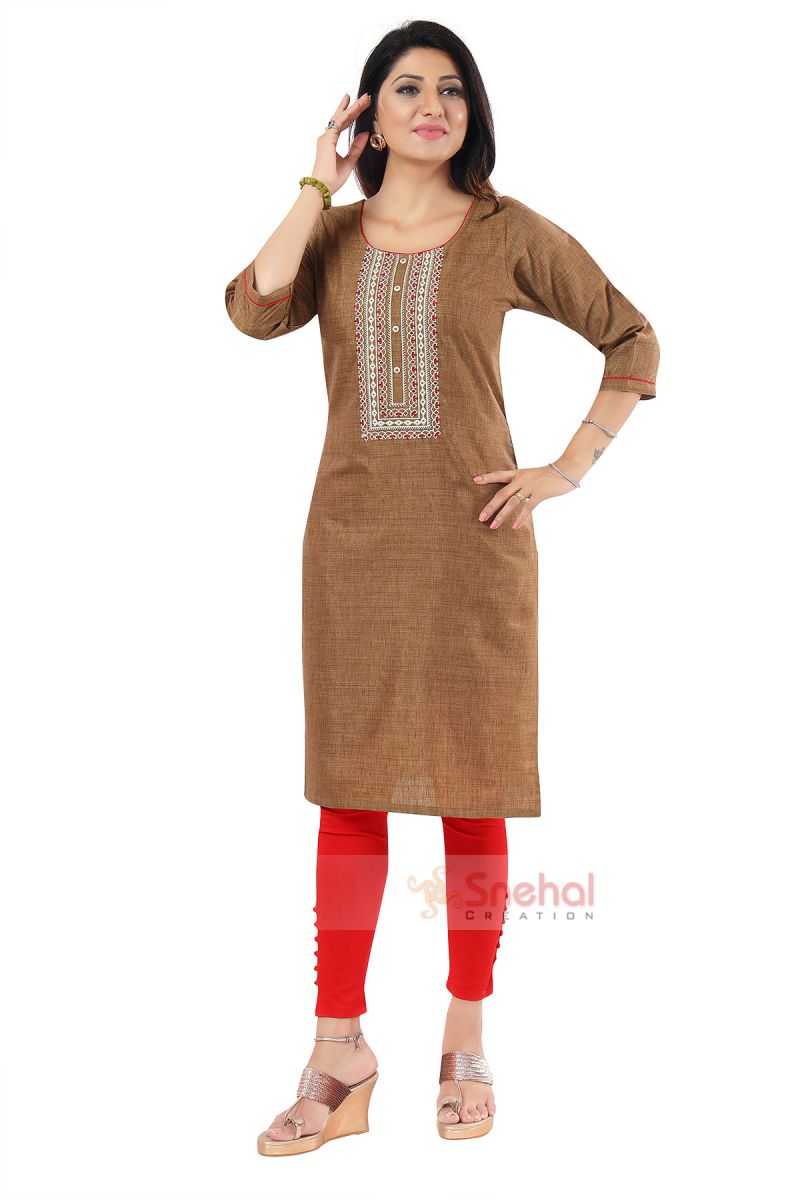 Switch your wardrobe with our summer collection Cotton Long Kurtis from Snehal creations. Experience the comfort wearing our designer casual Kurtis. Check out this beautiful brown embroidery kurti, helps you to look classy and elegant.