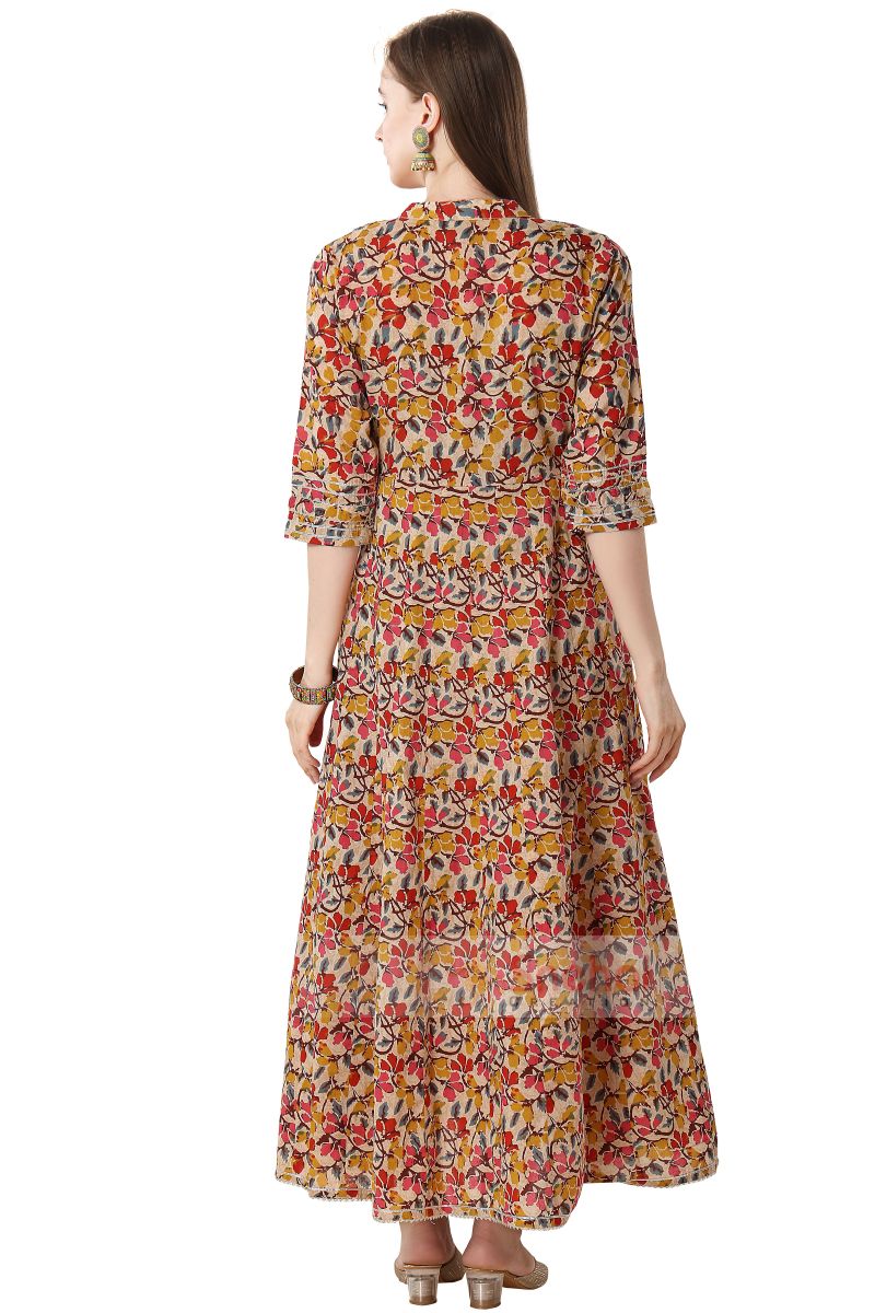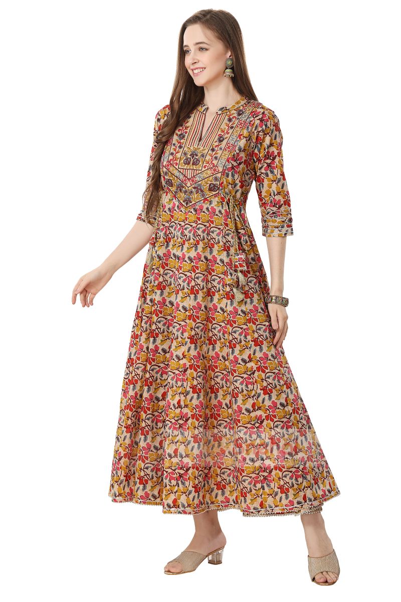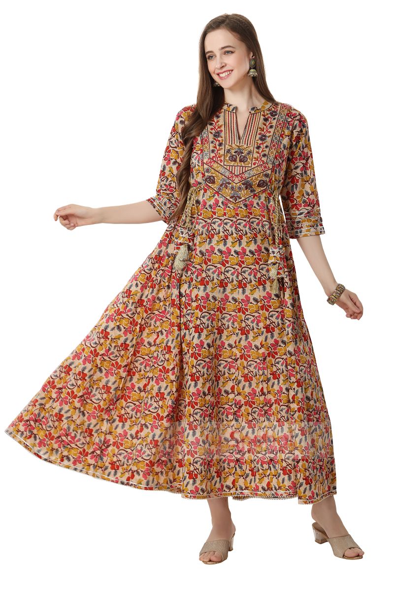 BEIGE GREEN ANARKALI GOWN WITH EMBROIDERY YOKE AND TUSSLES
