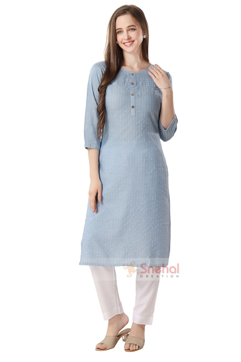 BLUE RAYON LONG KURTA WITH SILVER STRIPES