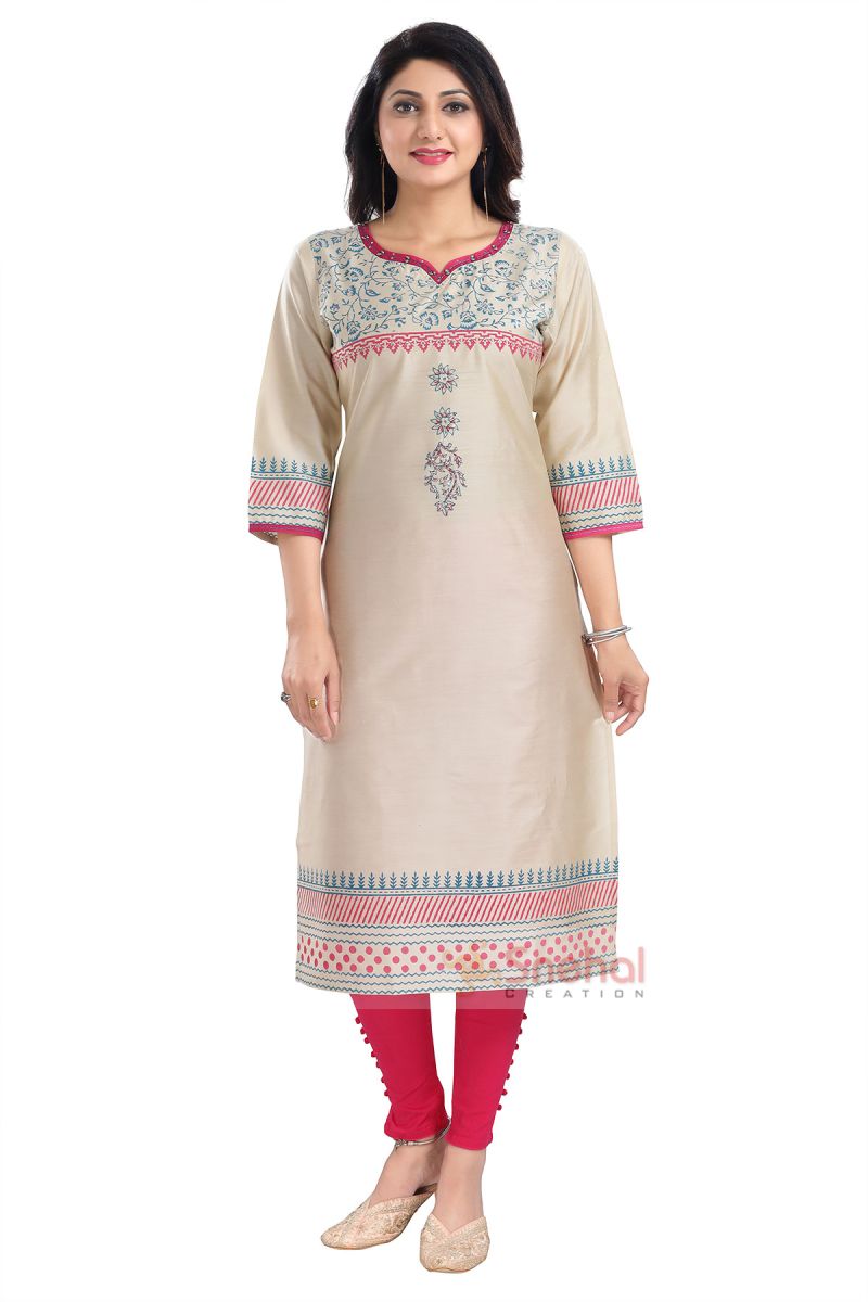 Beautacious Beige Cotton Silk Hand Block Print Long Kurta For Women