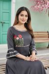 A swirl-worthy piece from the house of Snehal Creations, this Beauteous Gray Long Anarkali Styled Rayon Cotton Kurti is an absolute show stealer. The round neck tunic comes tailored with three fourth sleeves that are flared at the edges for the extra bit of drama in the design. The kalidar piece features amazing embroidery on the yolk. Gorgeous borders line the base of the main body of the tunic.The flared sleeves edges and neckline both come decorated with machine embroidery as well as lace.