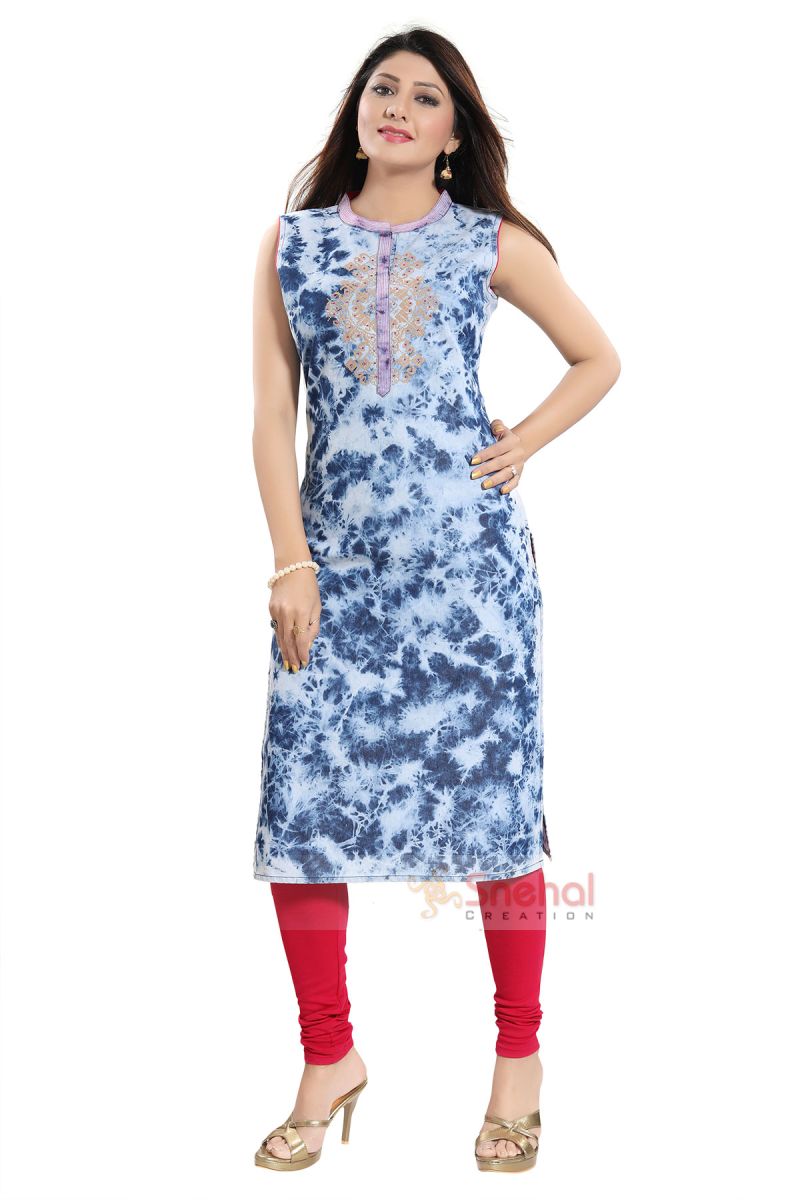 Be a stunner in the crowd as you don this Beautiful Batik Denim Sleeveless Tunic with Embroidery from the house of Snehal Creations.This piece features a pink tone ban style neckline and no sleeves whatsoever. The pink tone gala Patti comes adorned with intricate embroidery on each side. Team this beauty with a pair of contrast jeggings to steal the show!