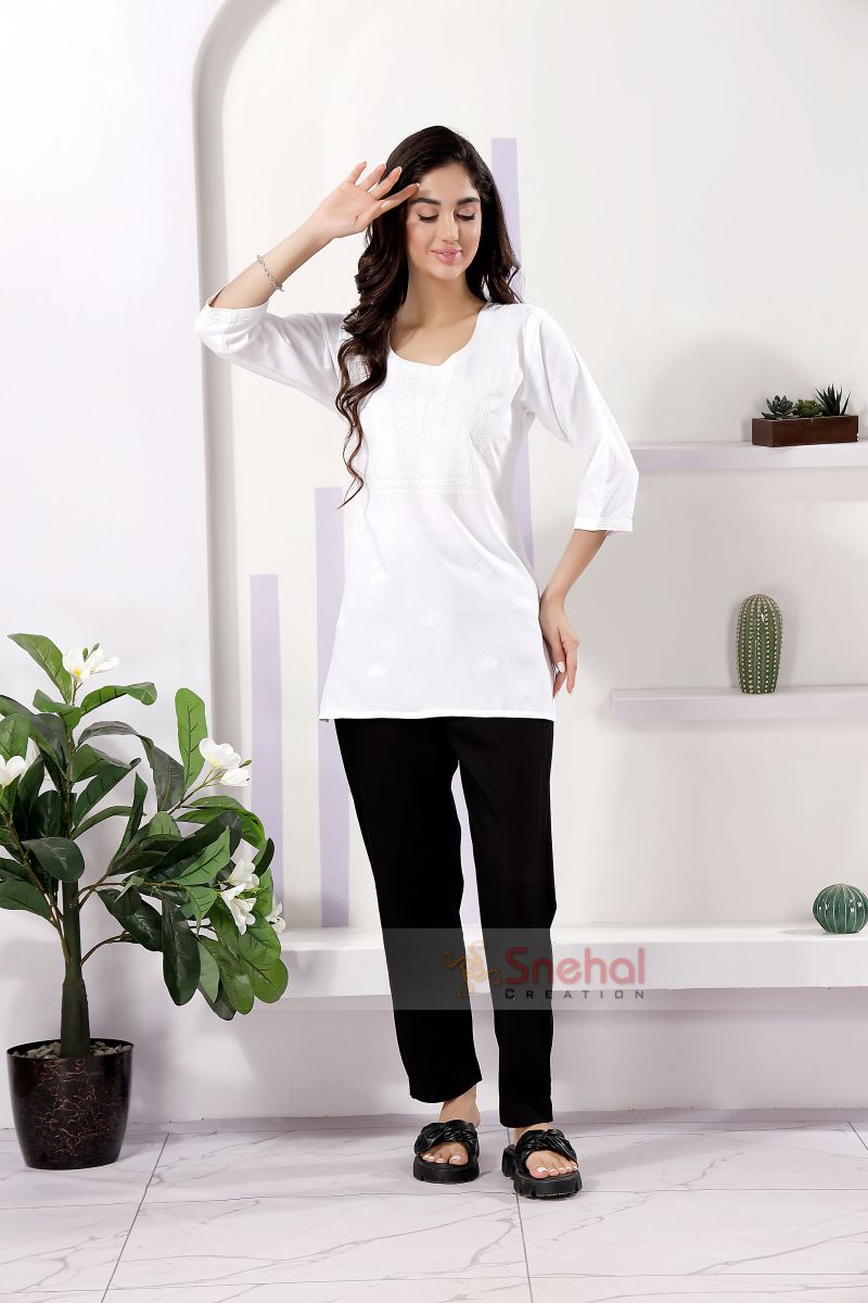 Introducing our elegant white rayon short kurti, a perfect blend of comfort and sophistication. This kurti features a graceful white hue, complemented by intricate chikankari work, adding a touch of traditional charm. The 3/4 sleeves offer a contemporary look, making it suitable for both casual and semi-formal occasions. Crafted from soft rayon fabric, this kurti ensures all-day comfort and a flattering fit. Pair it with your favorite bottoms and accessories for a chic, effortless style. Ideal for any wardrobe, this kurti is a must-have for those who appreciate classic elegance with a modern twist.
