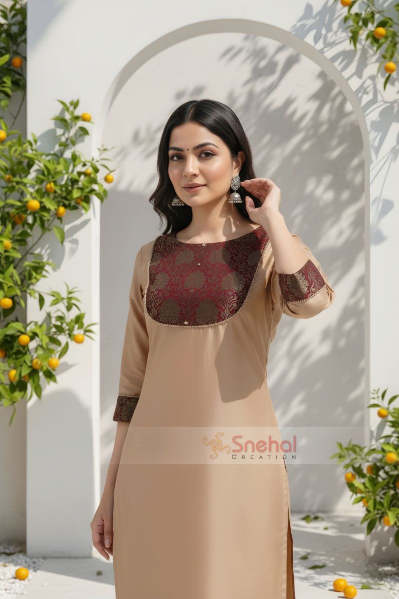 Beige Cotton Silk Long Kurti With Banarasi Yoke