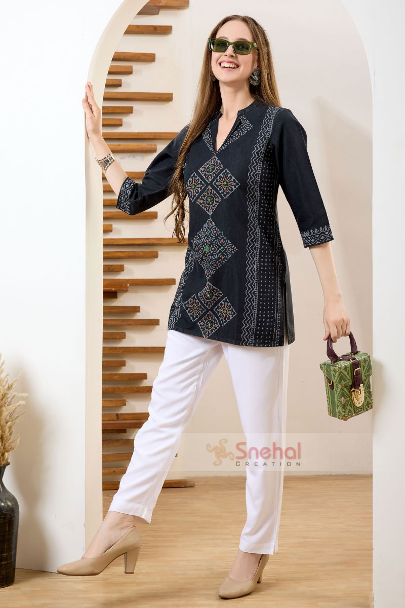 Stylish Ban Collar Denim Tunic With Hand Embroidery Yoke