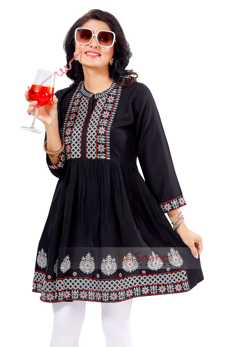 Blissful Black Rayon Women Embroidered Boho Chic Tunic Top for girls and women. Beautiful chikankari embroidery at the neckline, collar, sleeves and flare of this tunic makes it a party wear stuff.