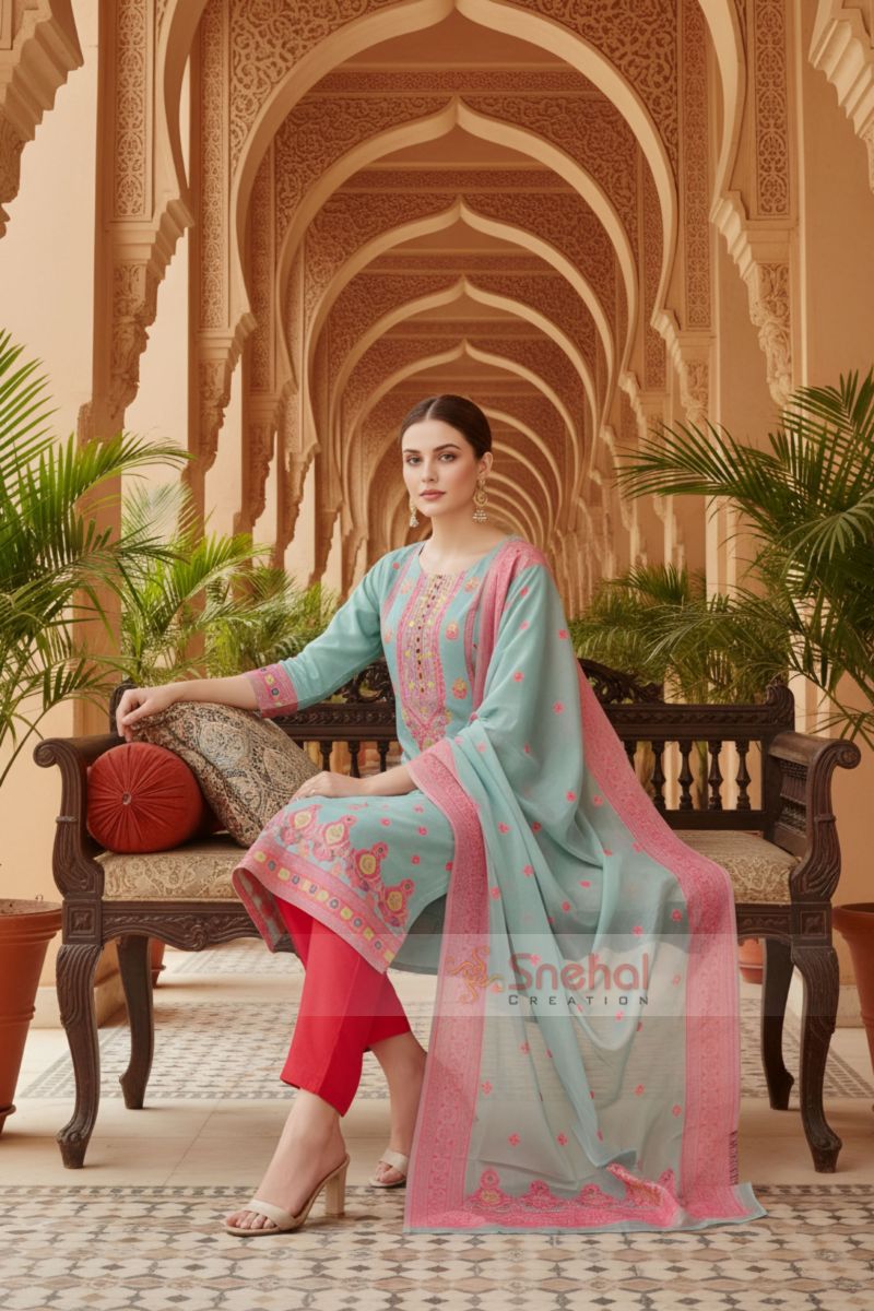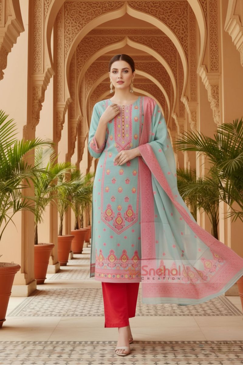 The straight-cut kurta features intricate traditional motifs with a richly detailed embroidered yoke and border accents, creating a refined ethnic appeal. Paired with a coordinated bottom and a beautifully patterned dupatta with contrasting borders, the ensemble offers a perfect balance of sophistication and comfort.