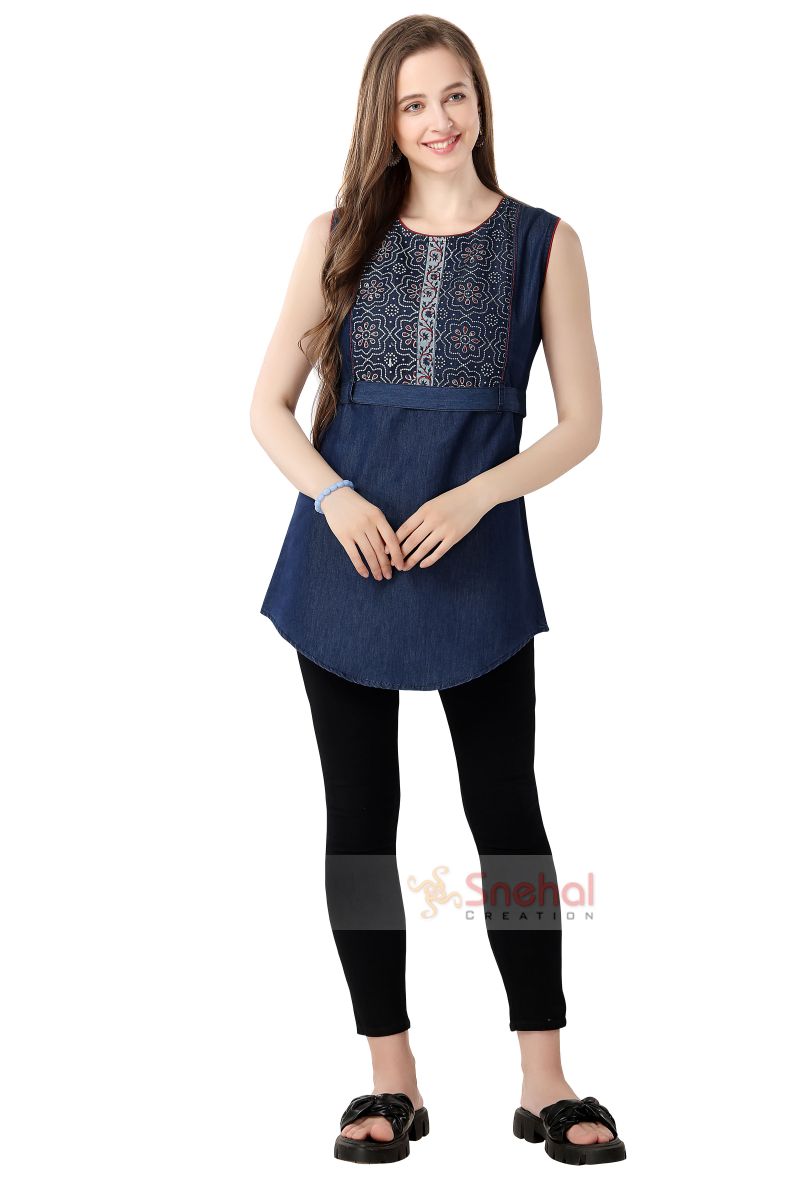 Stylish Blue Denim Sleeveless Tunic with Designer Yoke and Belt