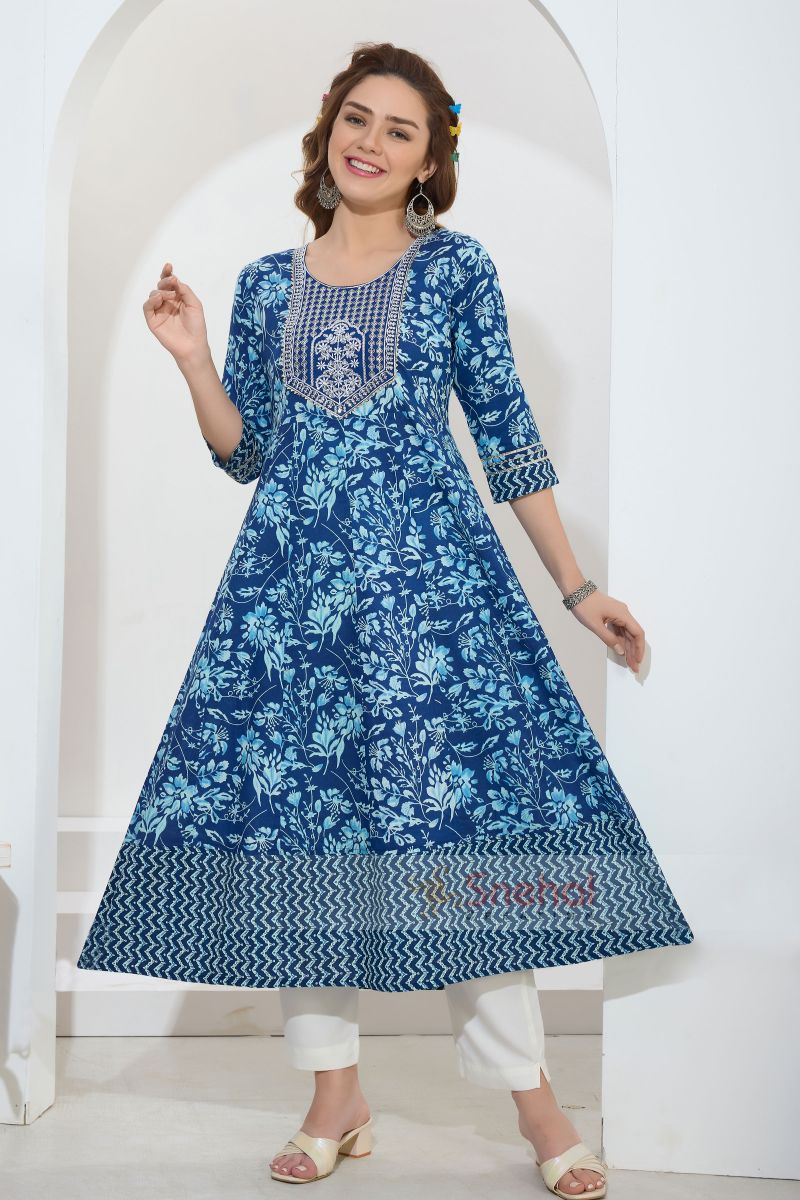 Blue Jaipuri Cotton Anarkali Long Kurti With Embroidery For Women.
