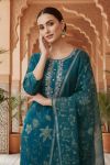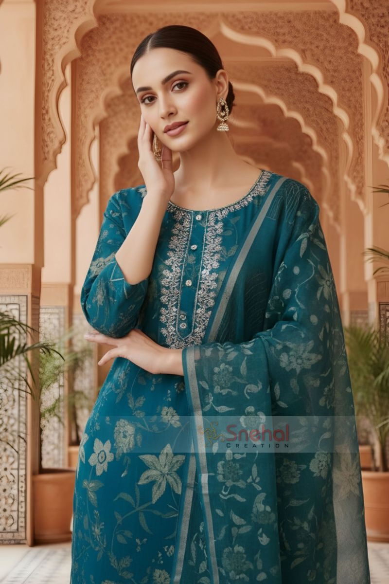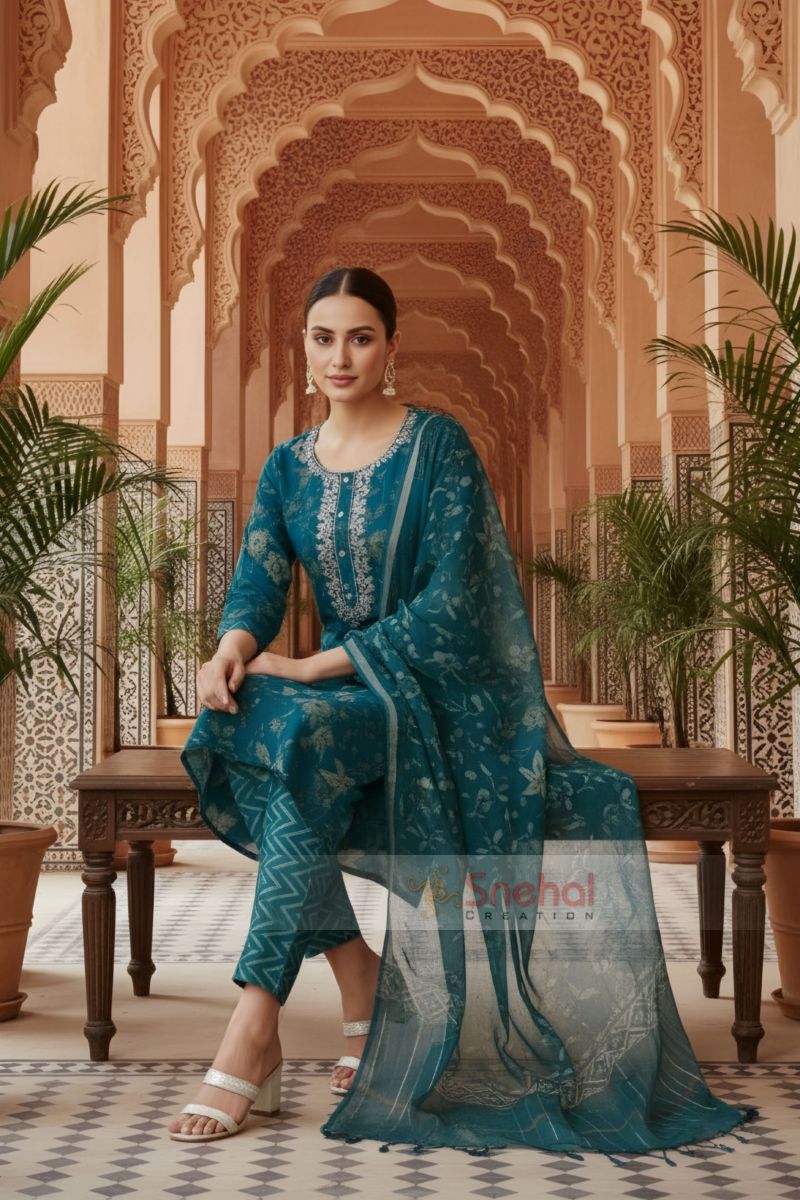 Add timeless charm to your ethnic wardrobe with this blue Jaipuri cotton printed 3-piece suit set. Crafted from soft, breathable cotton, the kurta features classic Jaipuri motifs and a beautifully highlighted front neckline adorned with delicate zari embroidery. Paired with a coordinated pant and a matching printed dupatta, this elegant ensemble is perfect for festive occasions, office wear, and refined everyday styling.