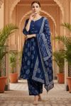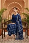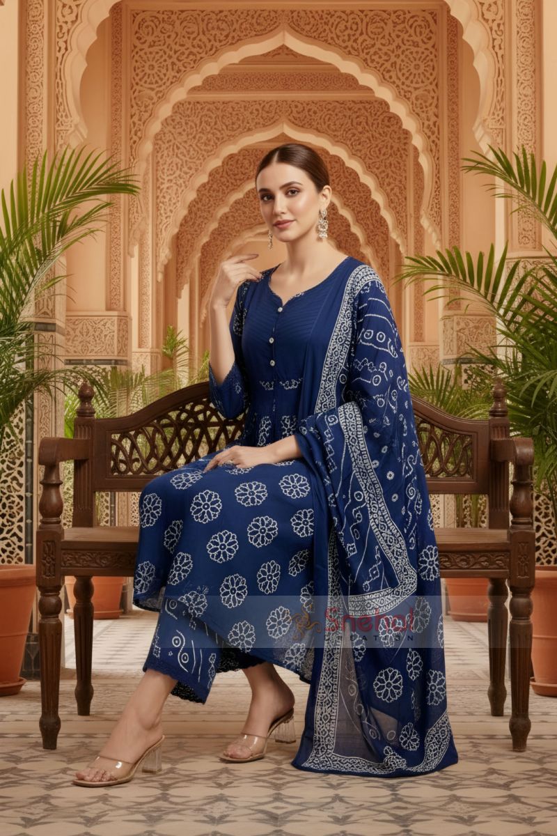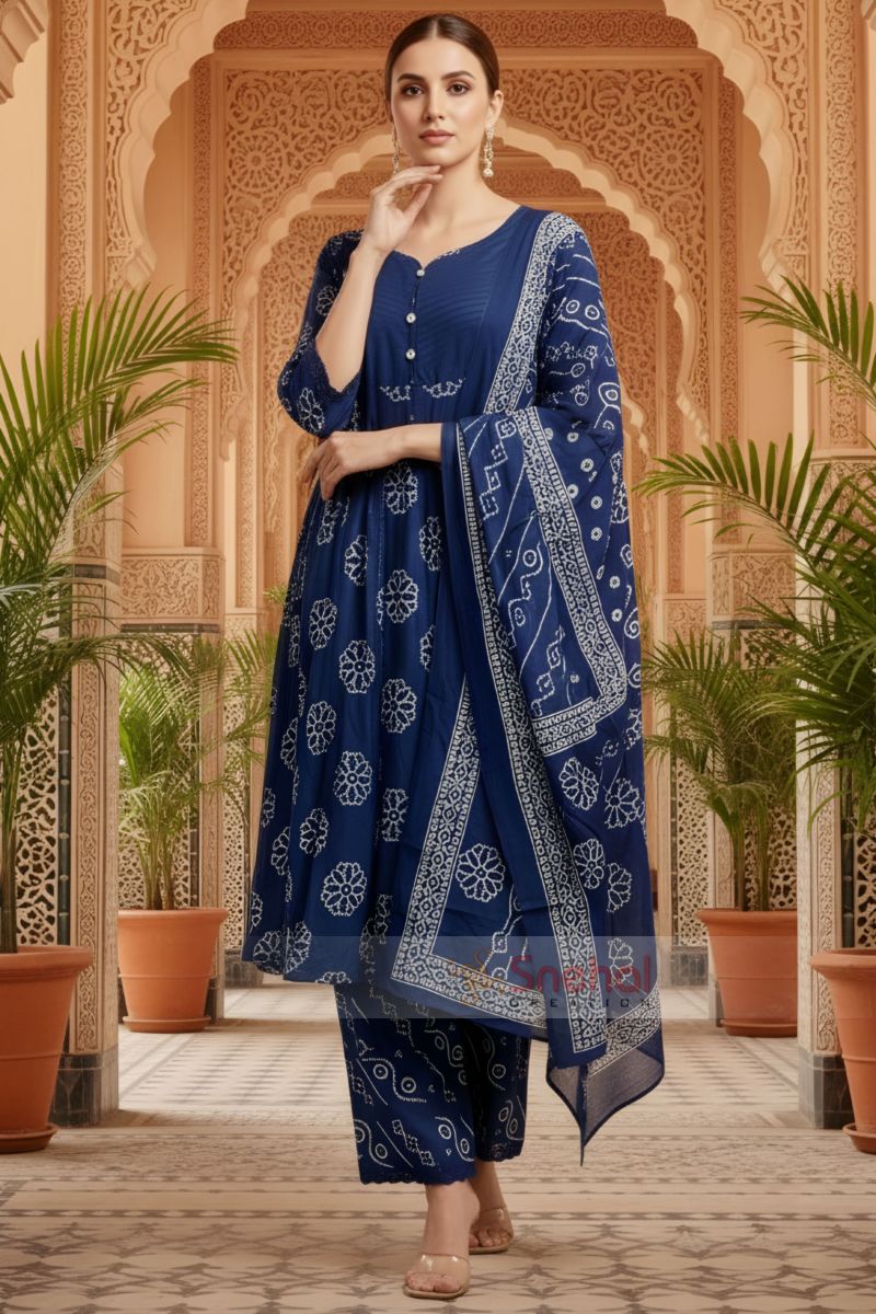 Enhance your ethnic wardrobe with this elegant blue Jaipuri cotton printed flared 3-piece suit set, designed for comfort and timeless appeal. Crafted from soft, breathable cotton, the flared kurta showcases classic Jaipuri motifs and features a beautifully highlighted front neckline with detailed stitching and yoke pattern, adding subtle structure and charm. Paired with a coordinated printed pant and a matching dupatta, this versatile ensemble is perfect for festive occasions, office wear, and graceful everyday styling.