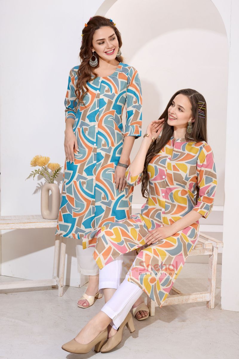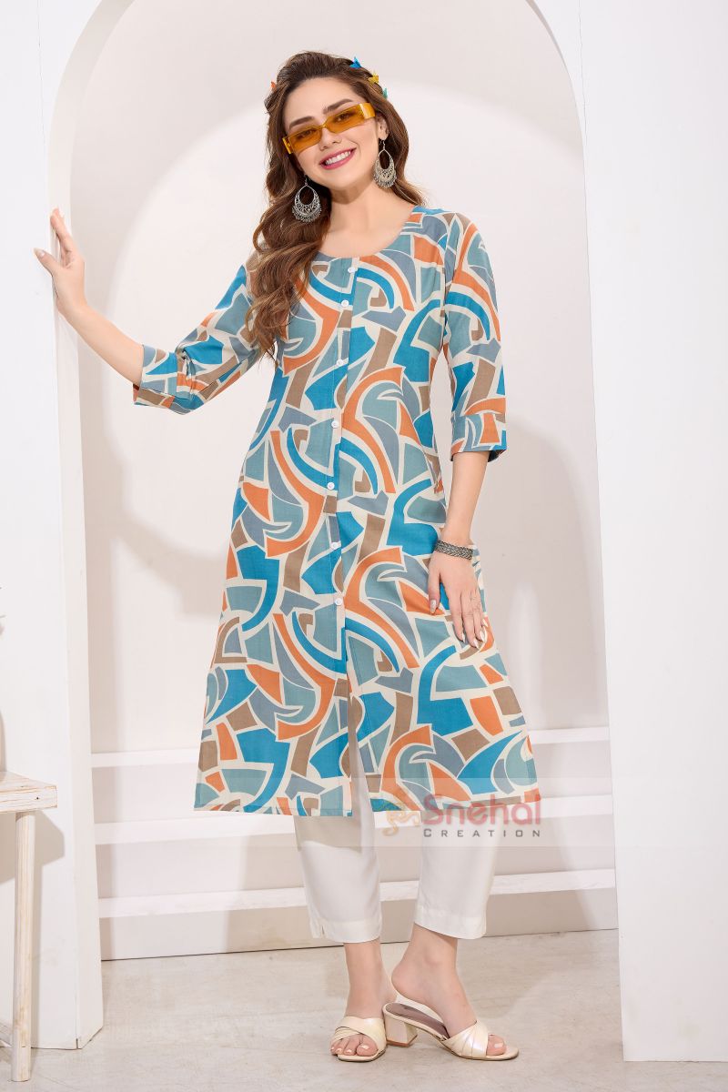 Blue Orange Linen Cotton Round Neck Women Long Kurta. Embellished with decorative buttons.