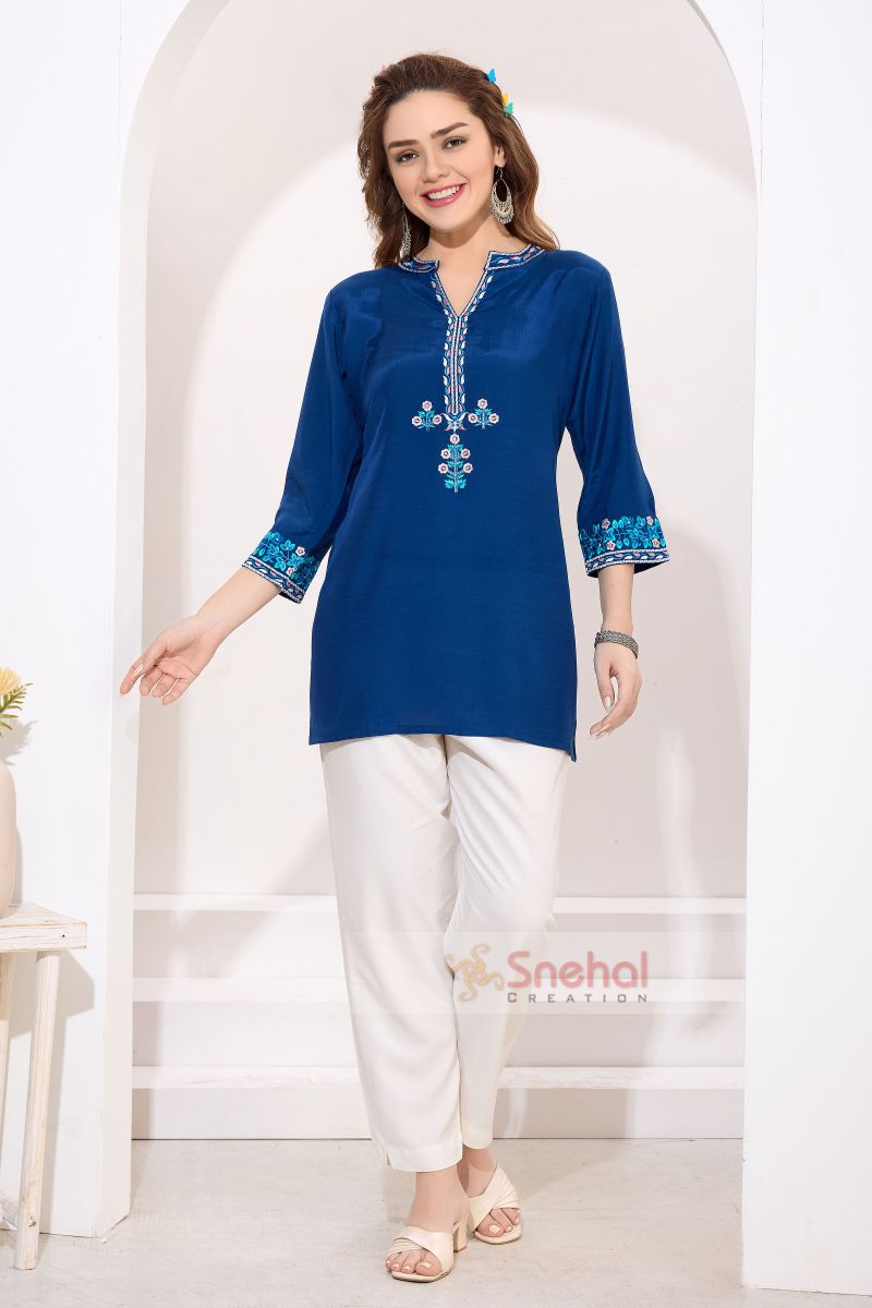 Blue Polysilk Short Tunic with Colorful Elegant Embroidery