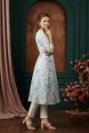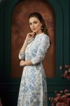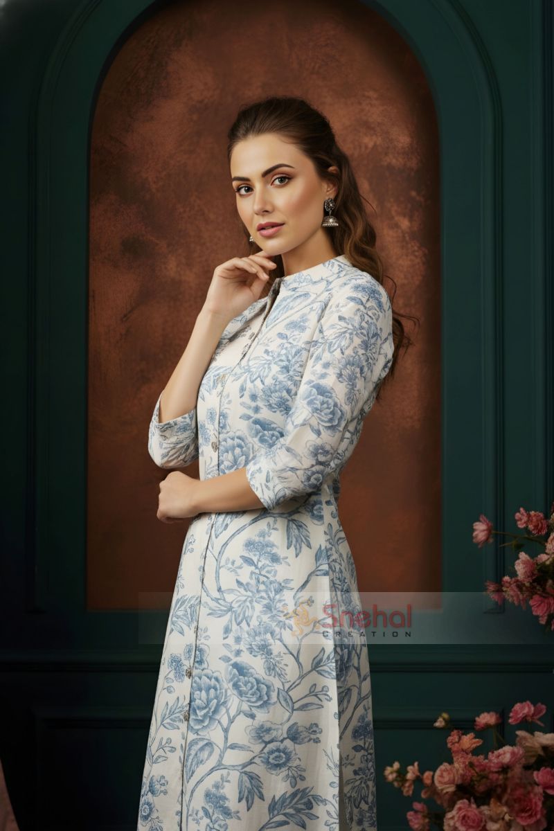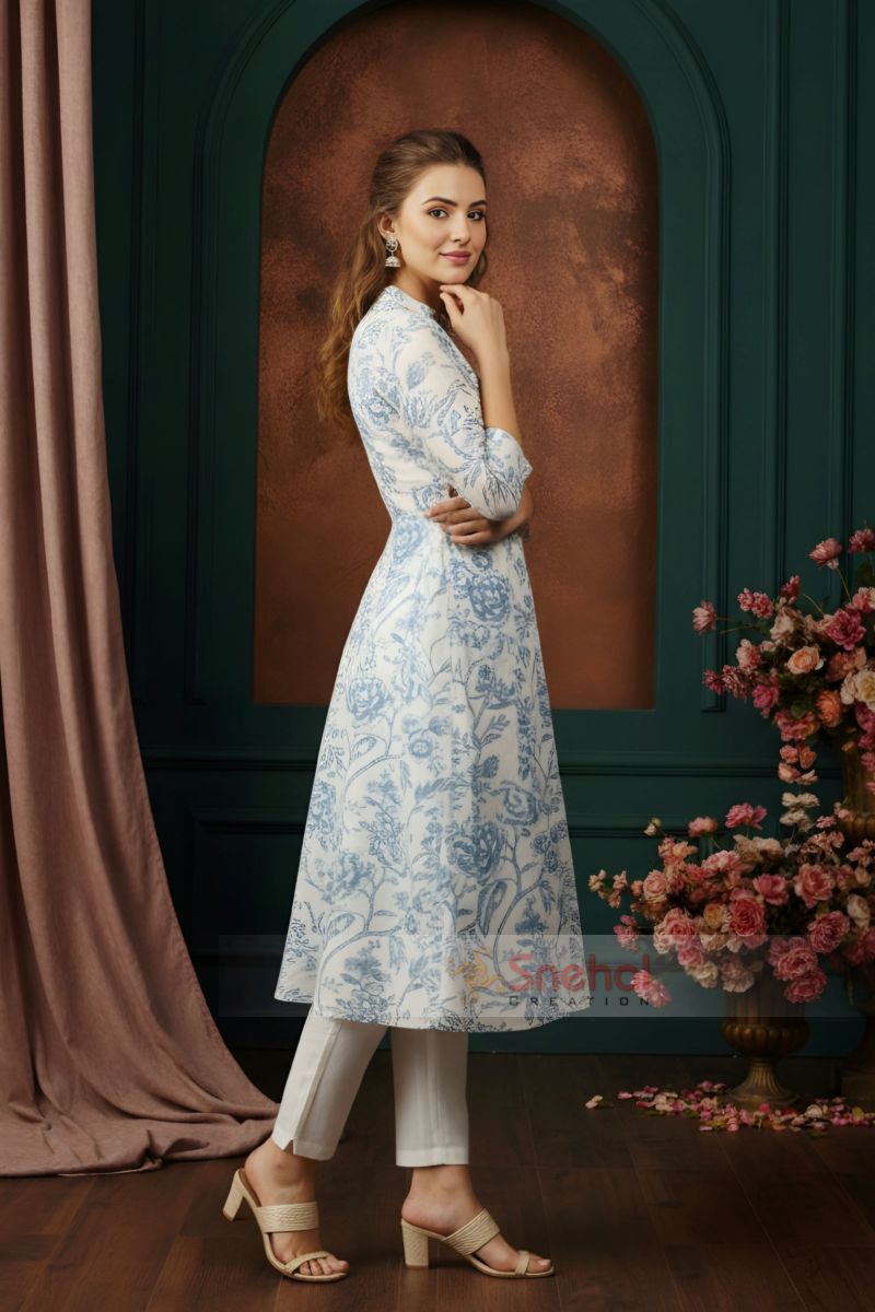Blue Rose Flower Print Linen Cotton Princess Cut Long Kurta For Women