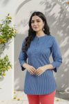Rejuvanate your fushion wear collection with this blue short kurti. The tunic is crafted with finesh quality cotton blended fabric, accents ban collar, three-quarter sleeves and an elegant pattern at the neckline. The curved hem is perfect for a casual night or day!