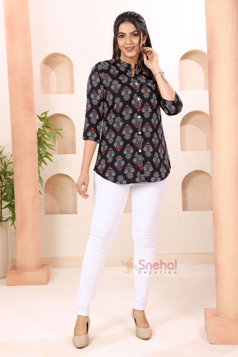 Bold Black Ban Collar Short Tunic Top for Women