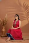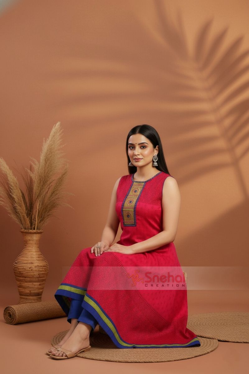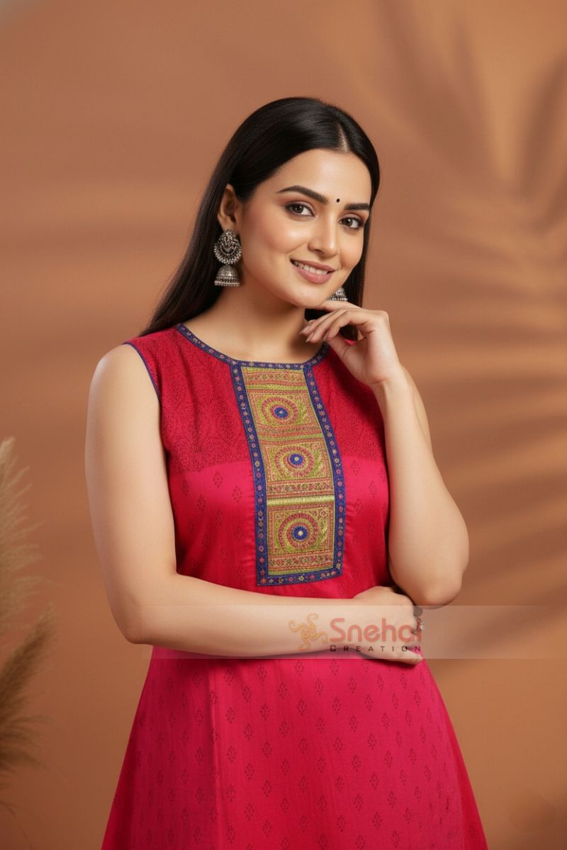 Make ‘comfort’ you summertime motto by choosing this Bold and Blast Hot Pink Raw Silk Sleeveless Tunic for Everyday Comfort Wear, a unique piece by Snehal Creation. Crafted to have a round neck sans any sleeves, this one is perfect piece for those sunny days out. Blue coloured taping around the neck followed by brown patch as neck panel decorate it beautifully and the A-line silhouette makes you appear leaner. Team it up with a chudidar of any contrast color and you are good to go.