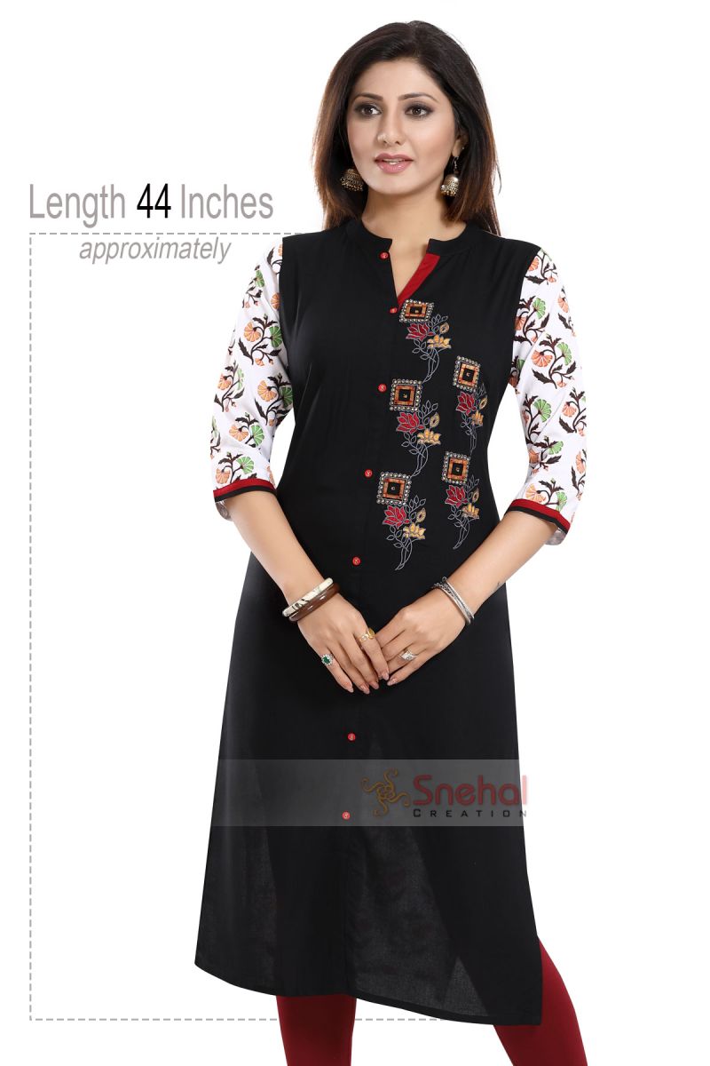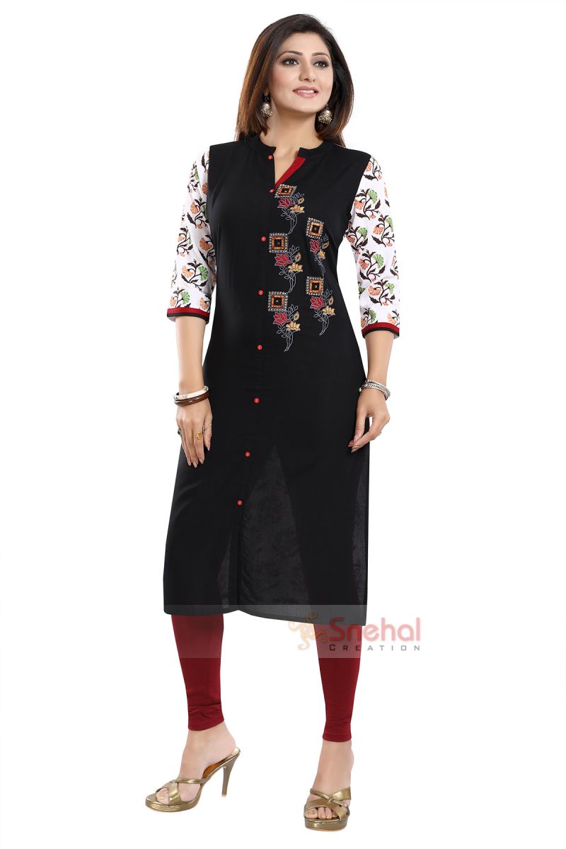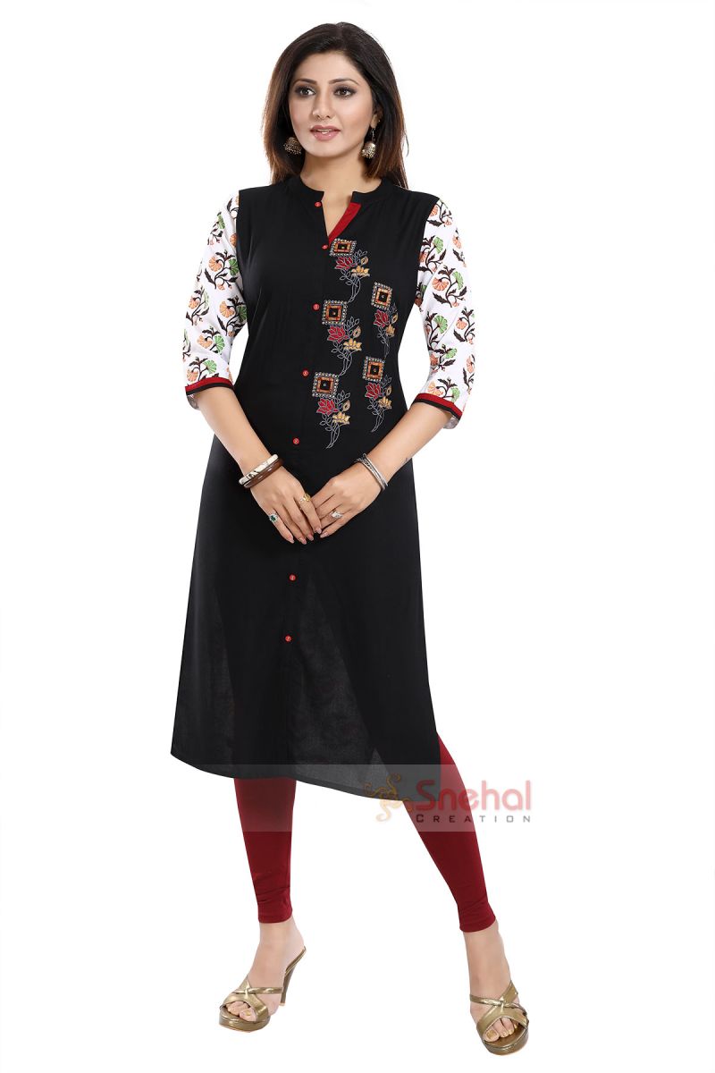 Get crisp on the fashion front with this amazing Bold in Black Rayon Cotton Long Straight Fit Tunic with Embroidery from the house of Snehal Creations. This designer piece features a black rayon cotton body with harlequin machine work embroidery. The neck of the tunic is a ban collar and the design follows a front open pattern. The three fourth sleeves of the tunic come printed with dual coloured taping at the edges.