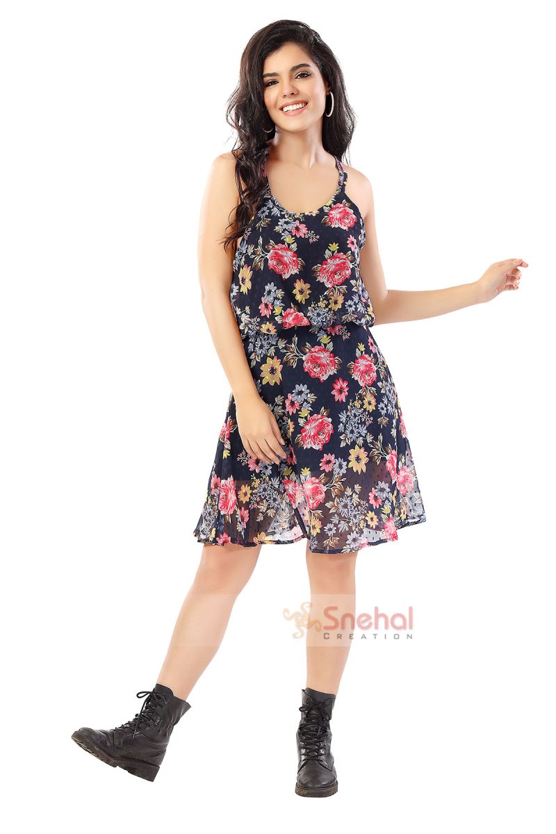 Bouquet Of Blooms Navy Floral Print Clip Dot Mini Dress For Girls