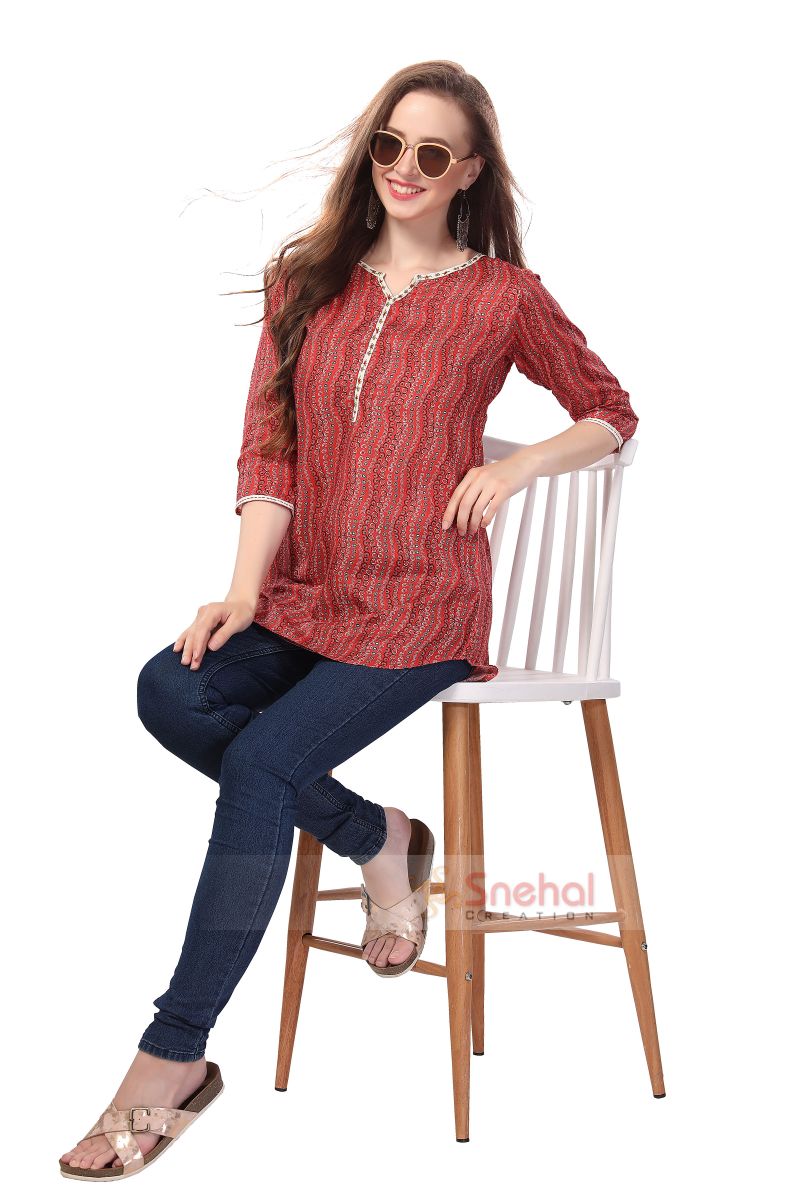 Brick Red Cotton Printed Tunic with Thread Work