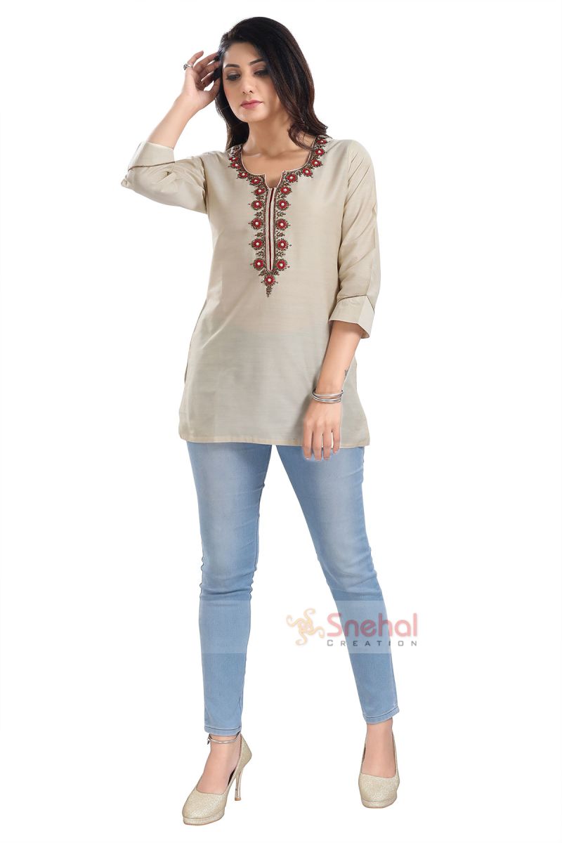 Bright Beige Cotton Silk Designer Beaded Tunic Top