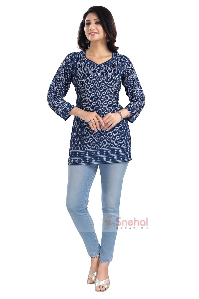 Bright Indigo Summer Cool Printed Short Kurti Tunic Top