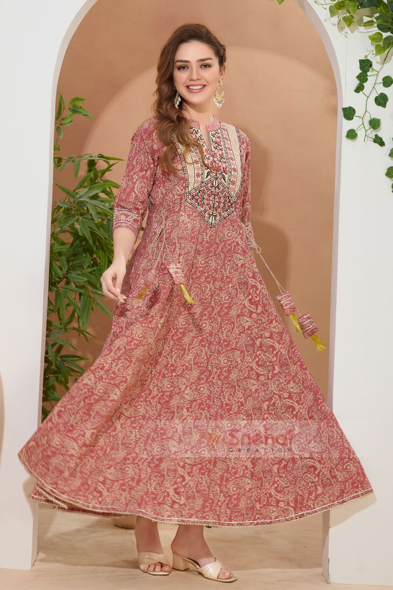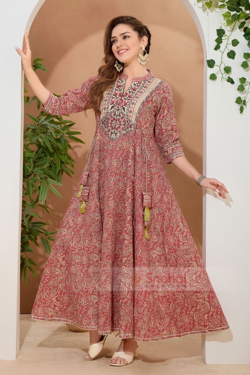 Fashionable-Coral-Anarkali-Kurti-in-Cotton-with-Mixed-Print-Patterns