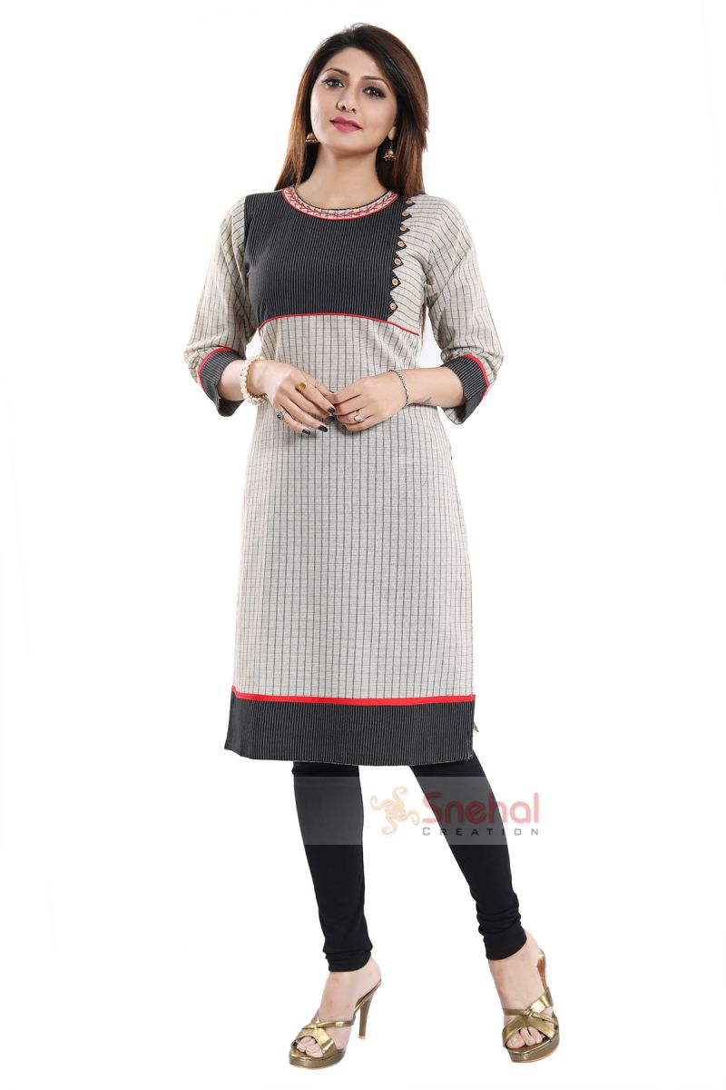 Craft a unique workwear look in this Captivating Cream and Black Cotton Tunic for Everyday Wear from the house of Snehal Creations. This round neck tunic has a dual coloured yolk and cream coloured body. The sleeves of the tunic are also dual coloured with distinct black cuffs. Interesting embroidery details decorate the neckline and stitching designs with buttons decorate the yolk.
