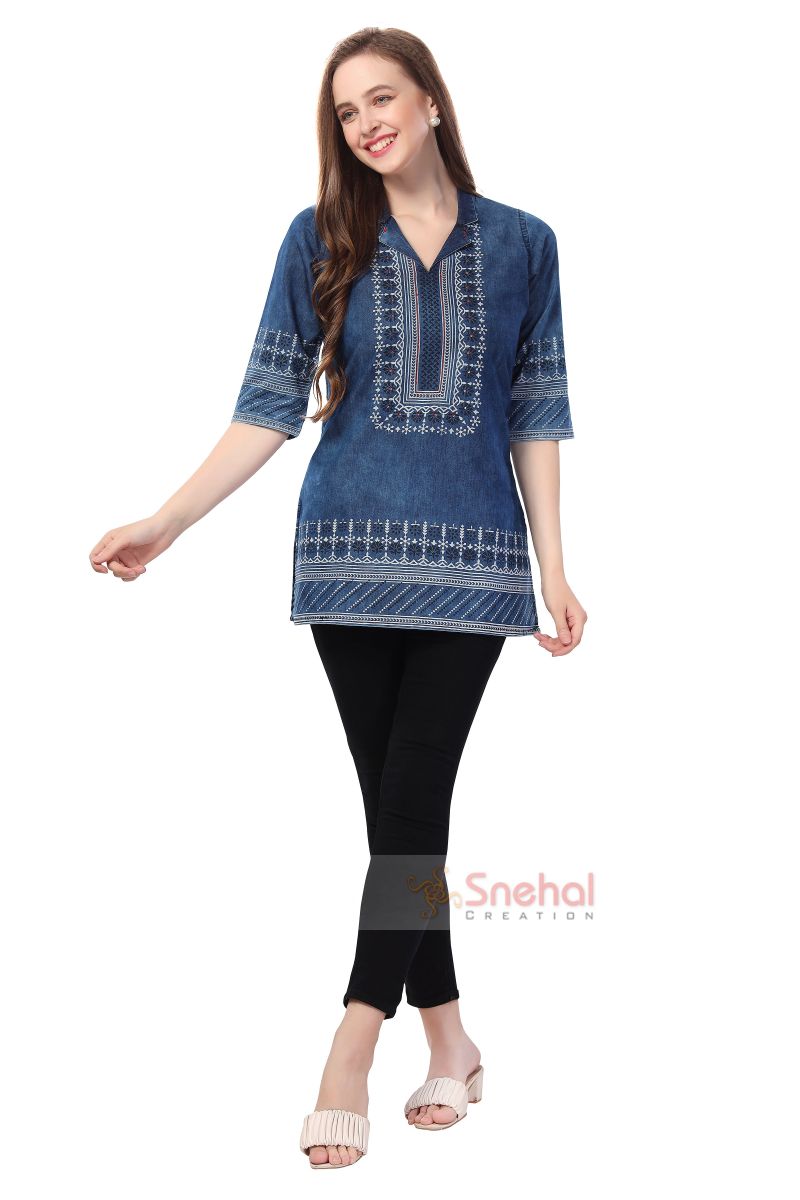 Embrace charm and sophistication with our Charm in Denim Cloud Wash Print and Thread Work on Coat Collar Tunic. This remarkable piece combines classic denim with contemporary artistry, resulting in a fashion statement like no other. The unique cloud wash print infuses a touch of creativity, giving the denim a distinct character. What truly sets this tunic apart is the intricate thread work, meticulously designed to create captivating patterns and textures on the coat collar. It is a masterpiece of craftsmanship that adds an element of elegance to your ensemble. Whether you are attending a special occasion or simply want to make a stylish impact, this denim tunic ensures you stand out with grace and flair. Experience charm redefined in denim with this exceptional piece.