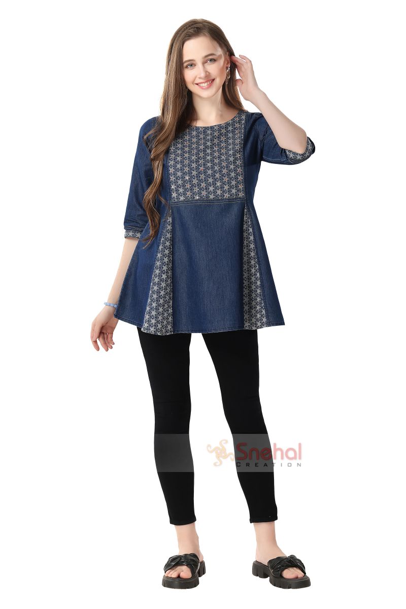 Effortlessly chic and comfortable, this Blue Denim Frock Tunic features a soft wash for a lived-in feel. Classic thread work adds a touch of elegance, while the discharge print gives it a unique, stylish look. The boat neck design and 3/4 sleeves make it perfect for any casual outing or relaxed gathering. Pair it with your favorite accessories for a versatile and fashionable outfit. Ideal for those who love a blend of classic and contemporary fashion.