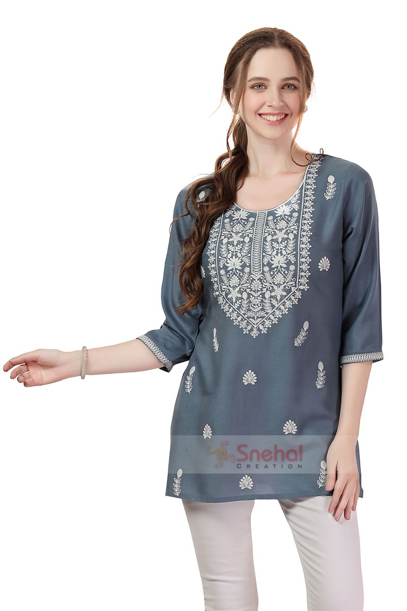 Elevate your style with our Chic Chikankari Rayon Kurti Tunic in Gray. Immerse yourself in the timeless charm of Chikankari embroidery, intricately detailed on the soft and breathable rayon fabric. The graceful gray hue adds a touch of sophistication, making this short kurti tunic a versatile piece for various occasions. Its contemporary design seamlessly blends tradition with modernity, offering a perfect balance of comfort and elegance. Whether paired with casual bottoms for a day out or dressed up for a special event, this chic gray Chikankari rayon kurti promises to be a wardrobe favorite, capturing the essence of refined style.