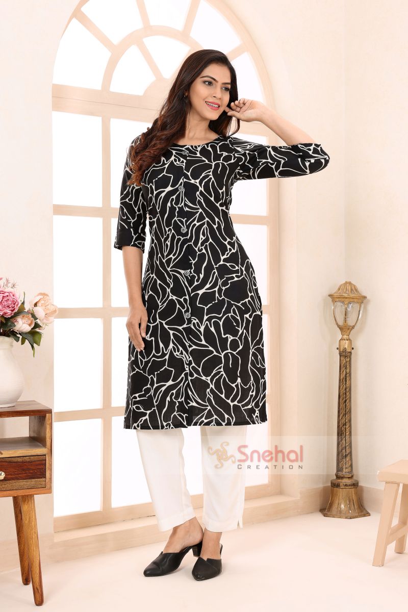 Chic In Black Linen Cotton Round Neck Women Long Kurta