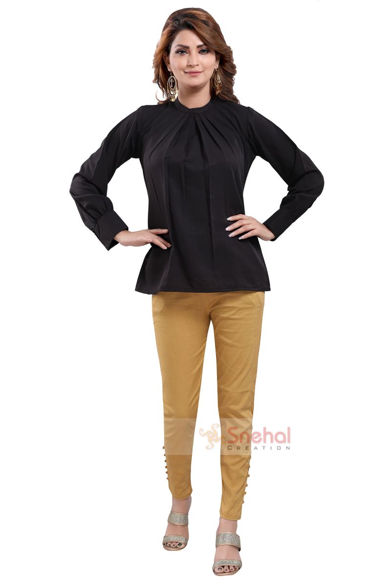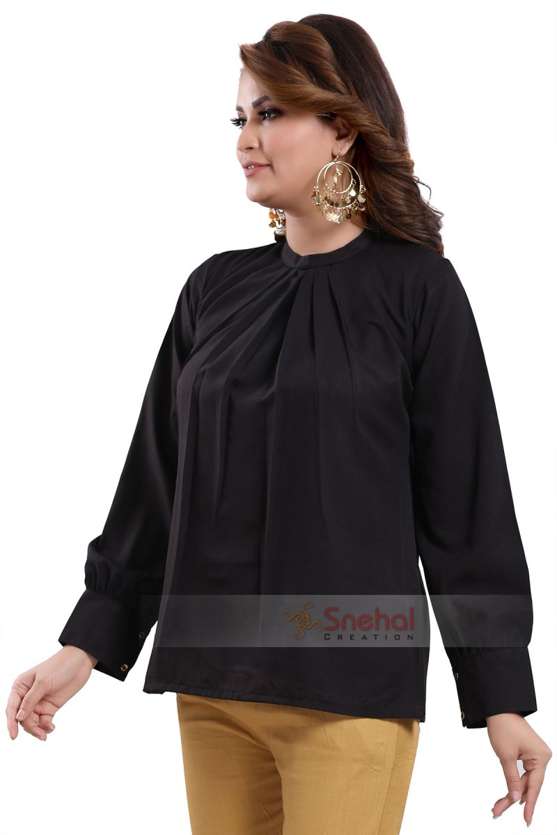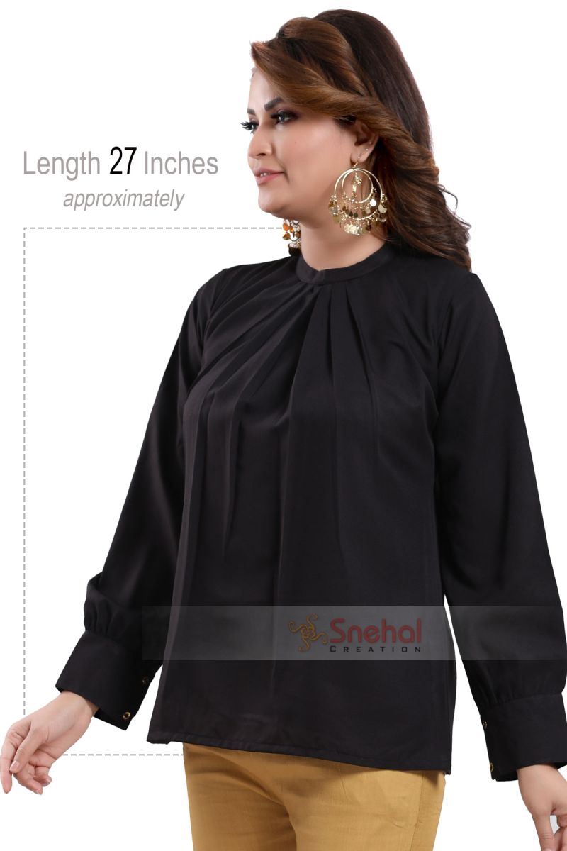 Take that bold step and crack the biggest deal confidently by styling this classic black beauty polyester crepe office wear short tunic top solely made and sold by Snehal Creation. It is a short-length tunic top that has a beautiful ban collar neckline with a pleated design going down to the bottom. The sleeves are full in length with buttons on the cuffs thus will save your arms from getting tanned. It is a plain classic black tunic top that is made from the premium quality of polyester crepe. It is one of the most preferred cloth types for summers as it is breathable yet comfortable.