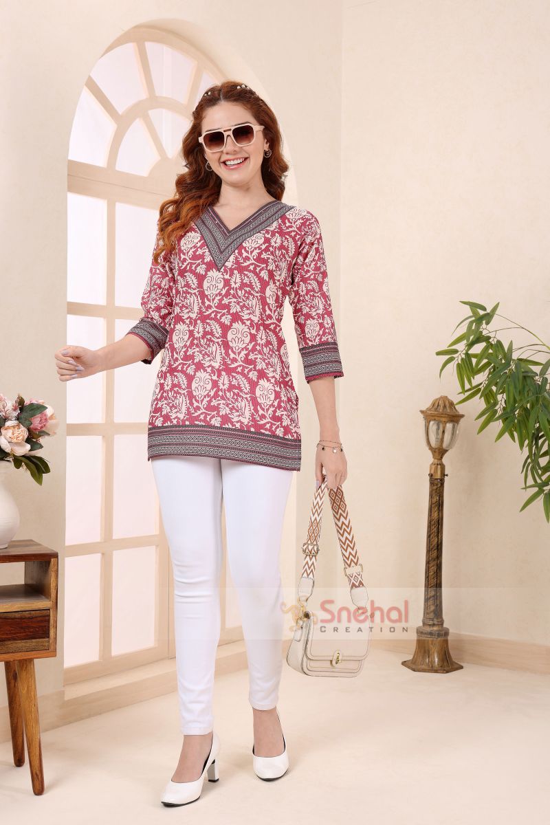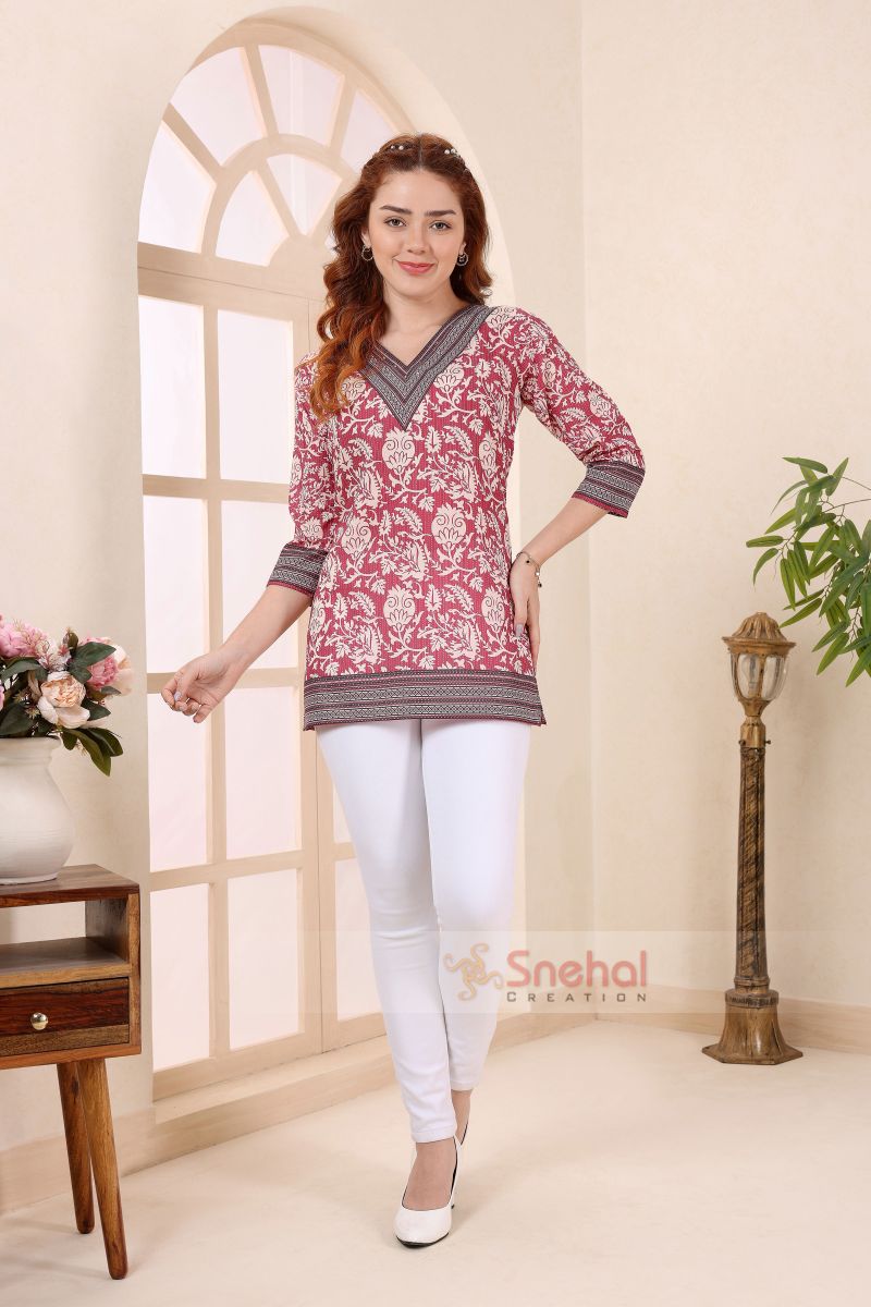 Coral Cotton V Neck Short Kurti Tunic Top for Women