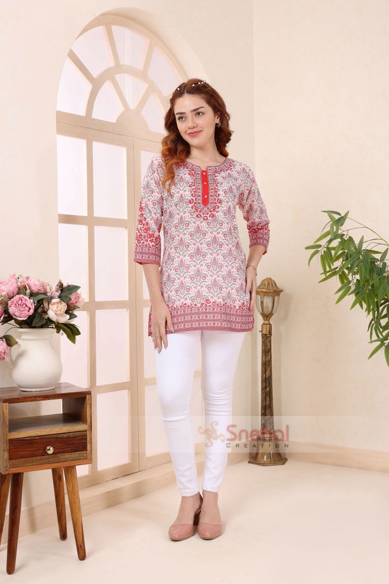 Coral Cotton V Neck Short Kurti Tunic Top for Women