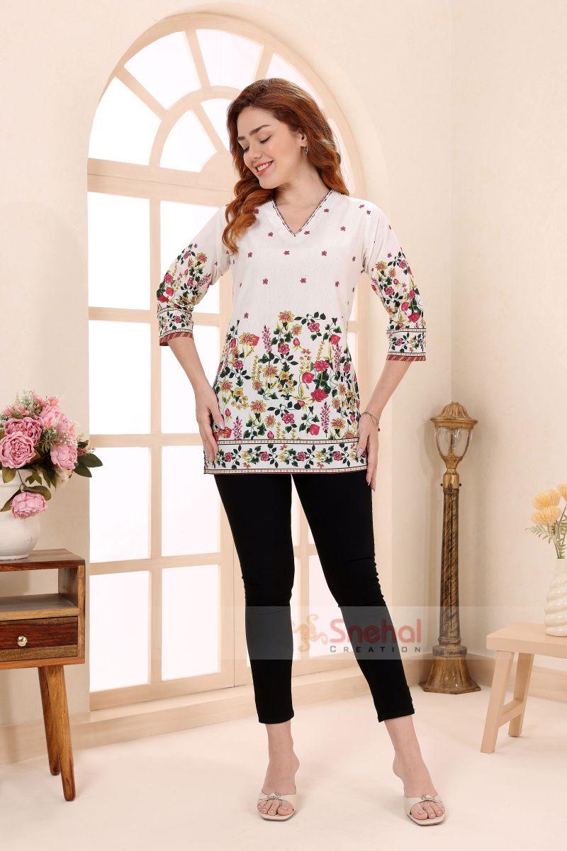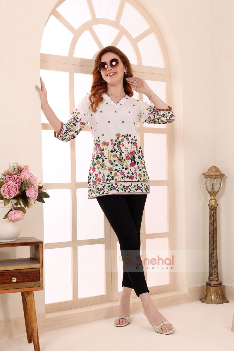 Cotton Short Kurti Tunic Top with Flower Motifs for Women