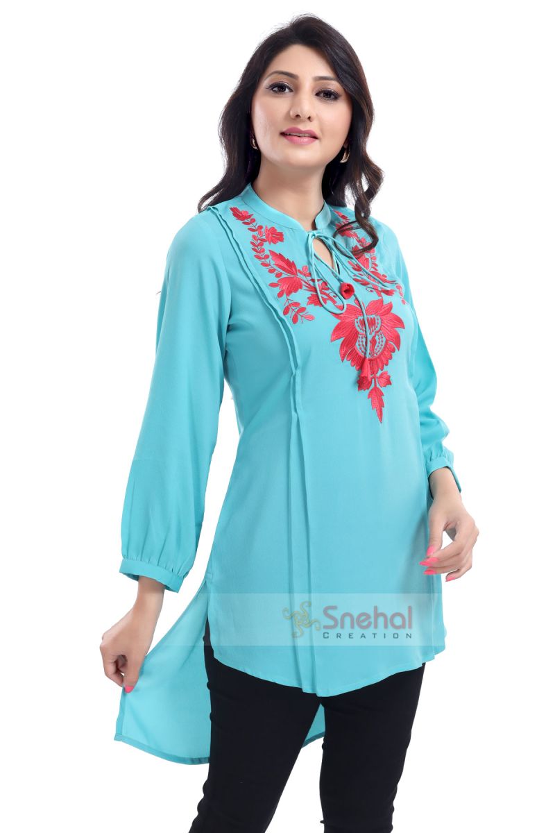 DESIGNER STAR CREPE FABRIC TUNIC TOP WITH EMBROIDERY NECKLINE AND HIGH-LOW PATTERN