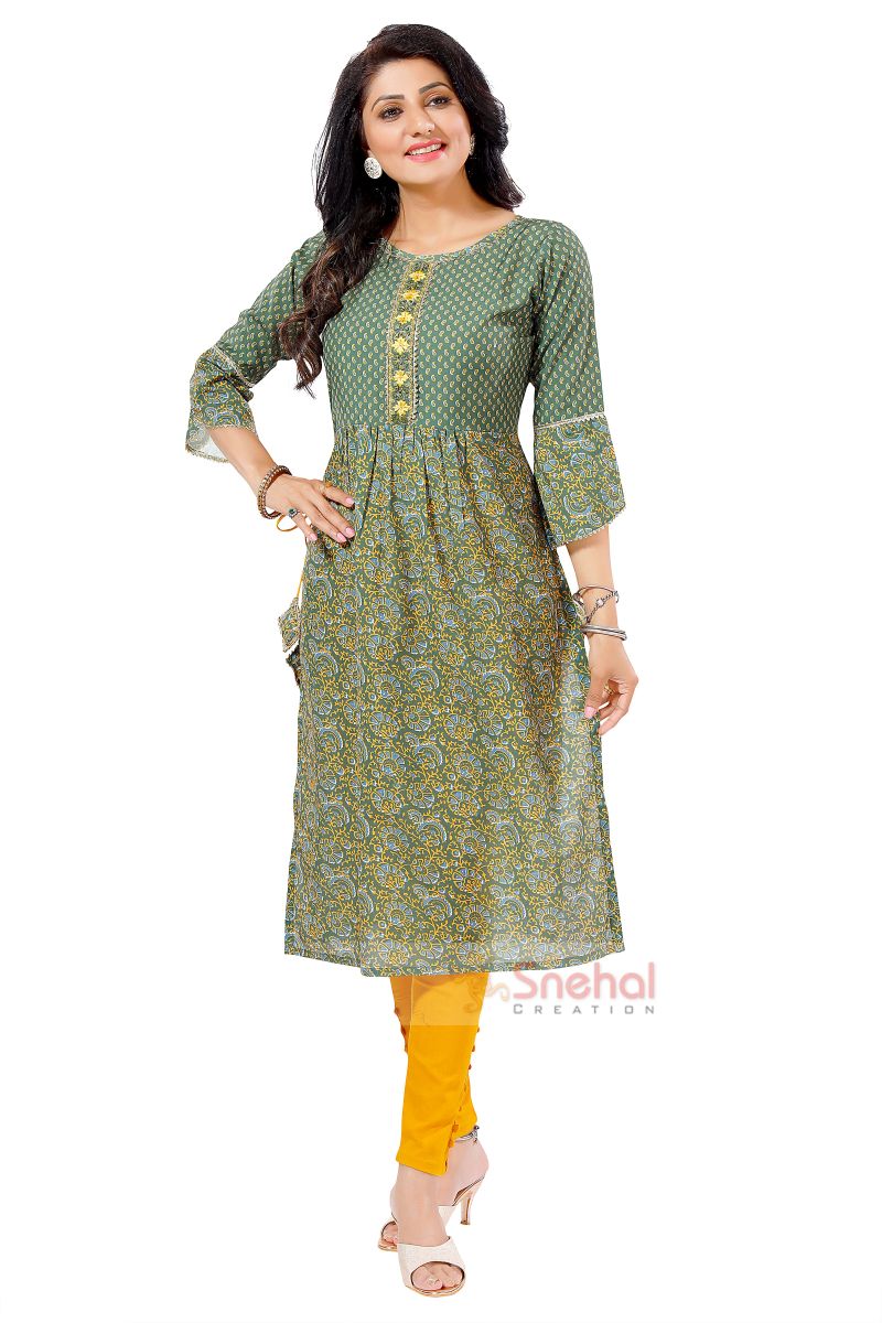 Best Quality Cotton Print Fabric Naira Style Long Kurti Embroidery at Neckline with Gota Laces Flare Style Sleeves