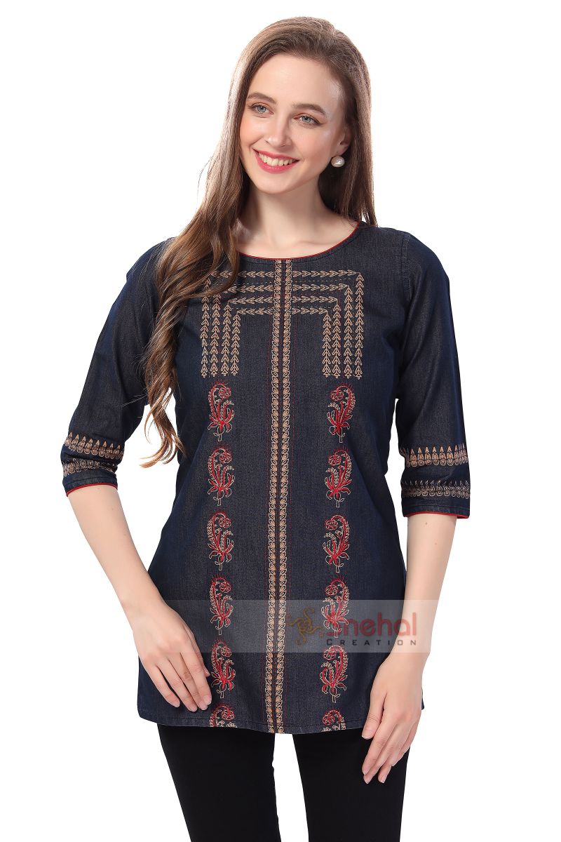 Indulge in the Denim Delight Short Tunic Featuring Color Wash Print and Thread Work, a contemporary masterpiece that effortlessly blends comfort and style. Crafted from soft denim, this tunic provides a relaxed and comfortable fit, making it perfect for both casual outings and special occasions. The captivating color wash print adds a burst of vibrancy and personality to your ensemble, while the meticulously detailed thread work elevates the tunic to a new level of sophistication. Whether you are strolling through the city or attending a social gathering, this denim tunic will make you stand out with its unique design and fashion-forward charm. Experience the delight of denim redefined with this exceptional piece that combines creativity, comfort, and elegance in one.