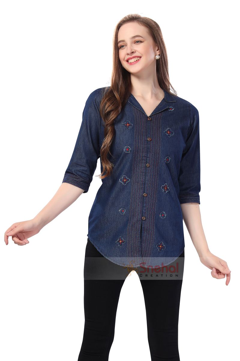 Versatile-and-Stylish-Blue-Short-Tunic-Top-for-Women Versatile-and-Stylish-Blue-Short-Tunic-Top-for-Women Charm in Denim Cloud Wash Print and Thread Work on Coat Collar Tunic Charm in Denim Cloud Wash Print and Thread Work on Coat Collar Tunic