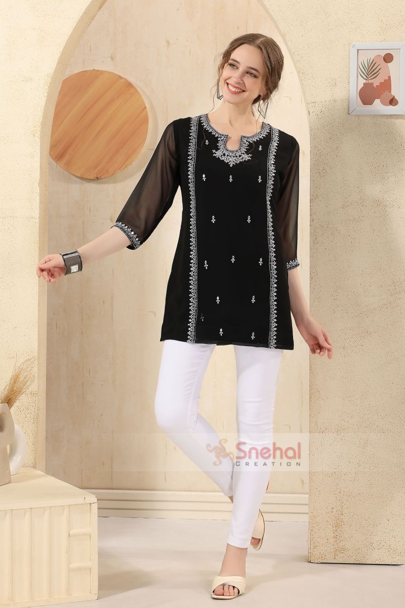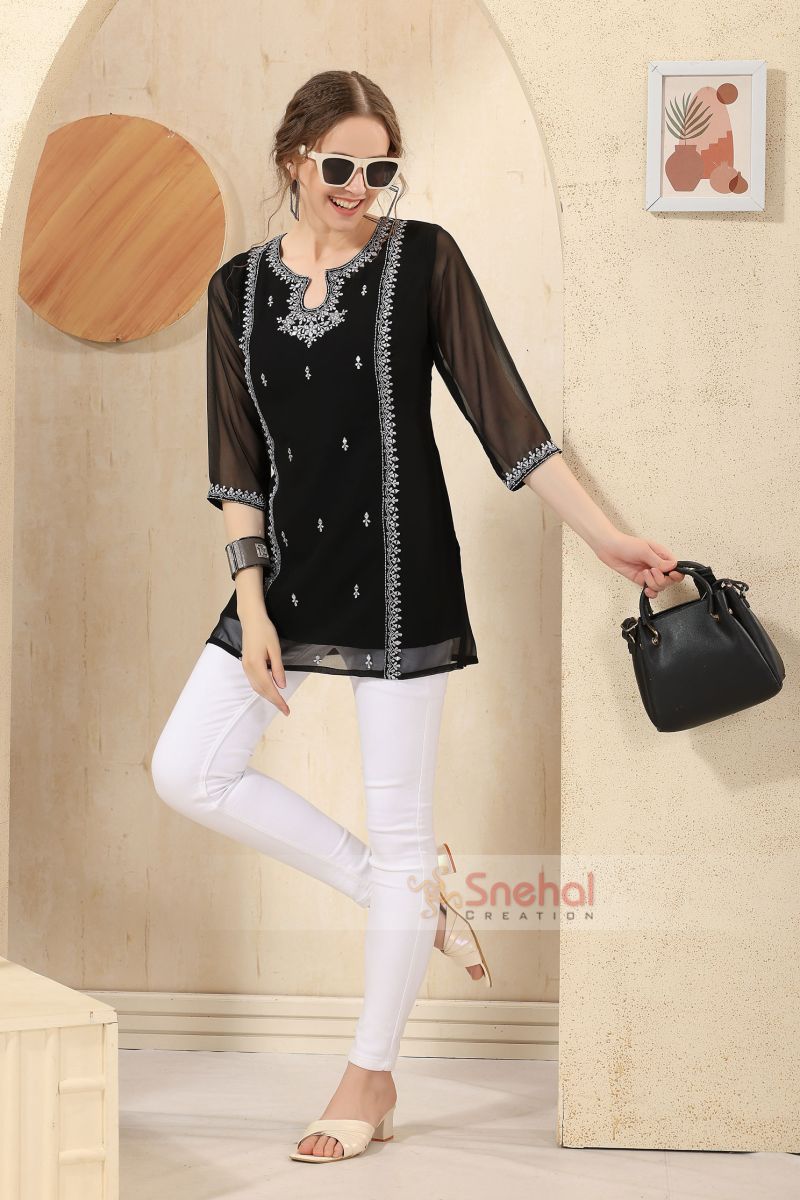 A classy black georgette tunic with intricate mirror embroidery on the front and sleeves. Designed with a soft inner lining for all-day elegance and comfort.