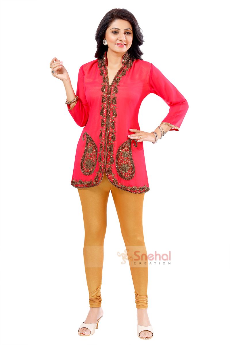 Be effortless in your style with this Pink Jacket Style Top with Beadwork Embroidery curated elegantly by Snehal Creations. A ban collar, long sleeves and centre panel come embellished with enchanting embroidery designs on this one. With fine georgette fabric on the outside to provide a sophisticated look and soft satin lining on the inside promising extravagant comfort; this Jacket style tunic top is the just thing your wardrobe needs right now!