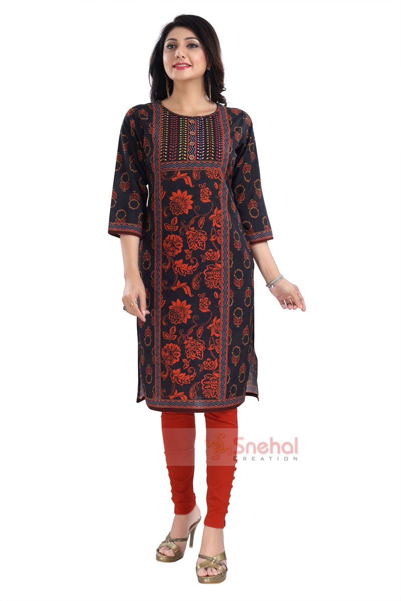 Elegant Black Designer Digital Print Cotton Slub Fabric Long Kurti Tunic