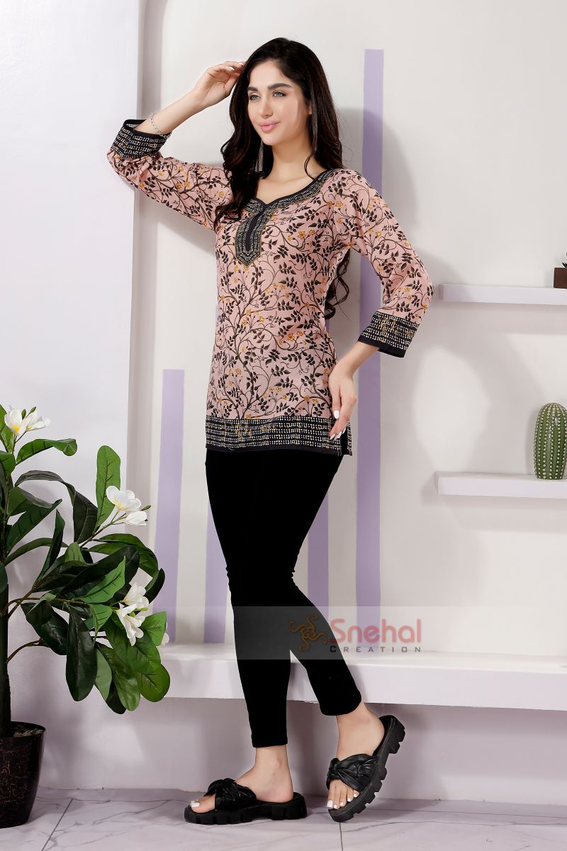 Crafted from high-quality cotton fabric, this kurti ensures breathability and comfort, making it ideal for all-day wear. The short length adds a contemporary twist, allowing you to pair it effortlessly with jeans, leggings, or skirts. Whether you are heading to a casual outing, a day at the office, or a relaxed weekend, this kurti is the perfect choice for a chic and comfortable outfit.