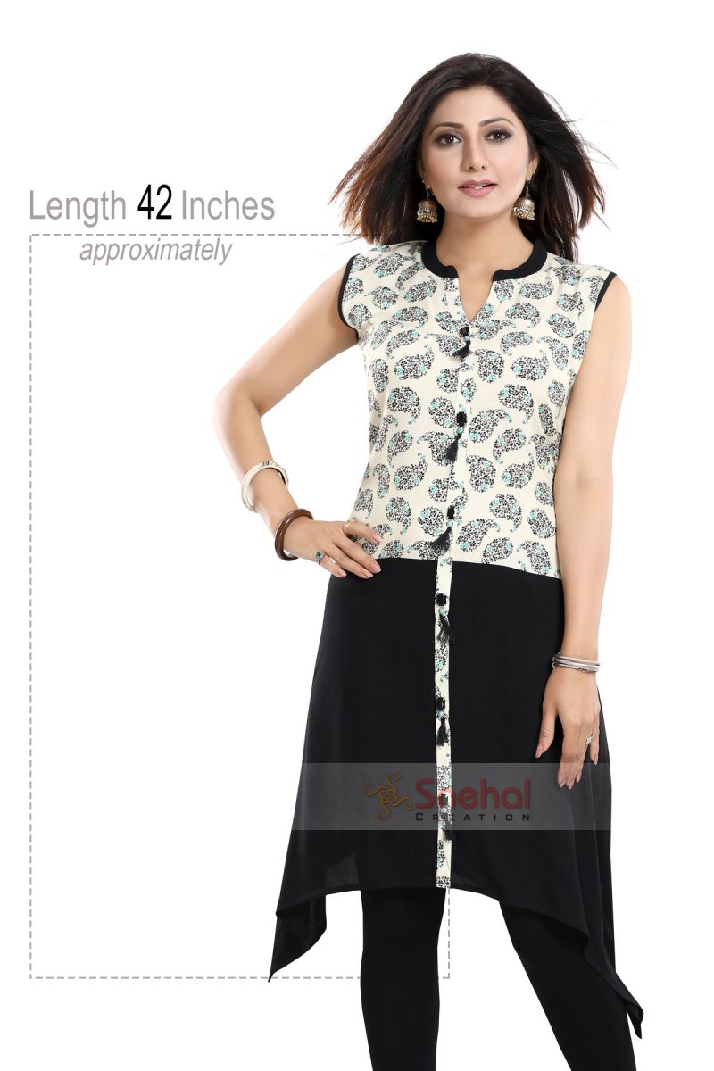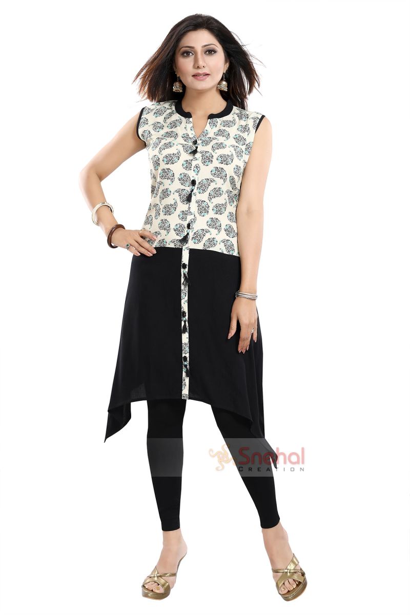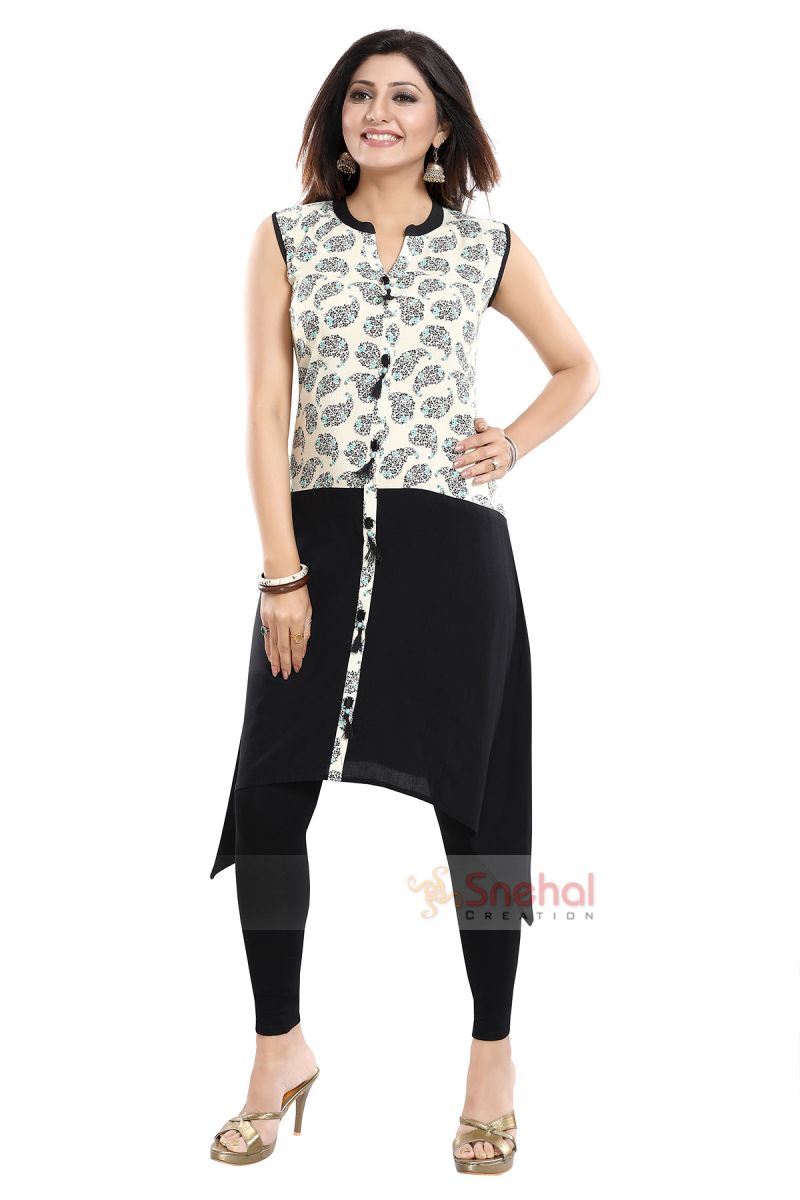 Looking for a color-blocking sizzling sleeveless kurta? Get your hands on this elegant rayon black and cream tunic top kurta with show buttons exclusively made and sold by Snehal Creation. It is a sleeveless knee-length kurta with a decolletage neckline and tail cut at the bottom. It has got a beautiful black print on the paisley motifs upper half and shows buttons with tassels from top to the bottom. Short sleeves also come attached with the kurta in case you want to get them stitched for your comfort. It is made from premium quality rayon which fits like a dream.