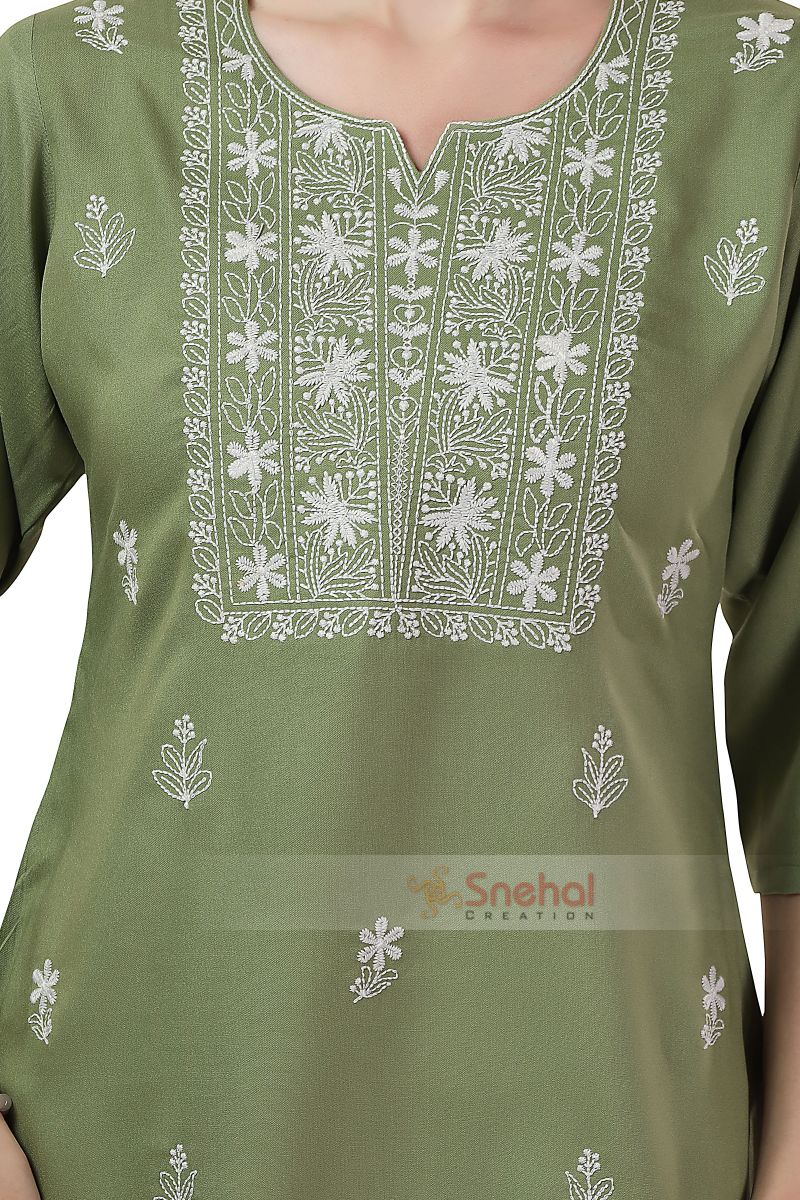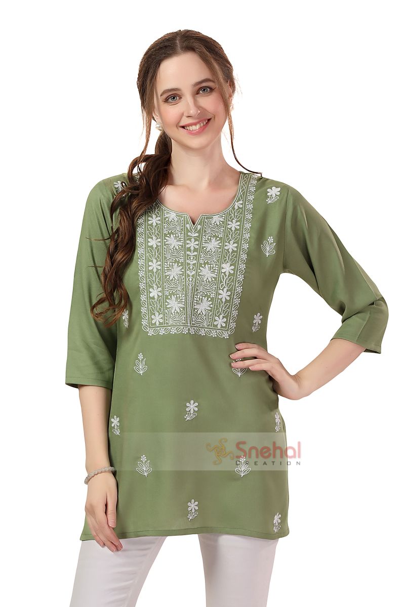 Indulge in the epitome of grace with our Elegant Rayon Pista Chikankari Kurti Tunic. Crafted from luxurious rayon fabric, this short tunic is a perfect blend of comfort and style. The soft pista green hue adds a touch of sophistication, while intricate Chikankari embroidery elevates the piece to a new level of elegance. Whether you are attending a festive occasion or opting for a casual day out, this kurti tunic effortlessly combines cultural charm with contemporary fashion. Embrace the beauty of tradition and comfort in this meticulously designed ensemble, tailored for the modern woman seeking timeless sophistication.